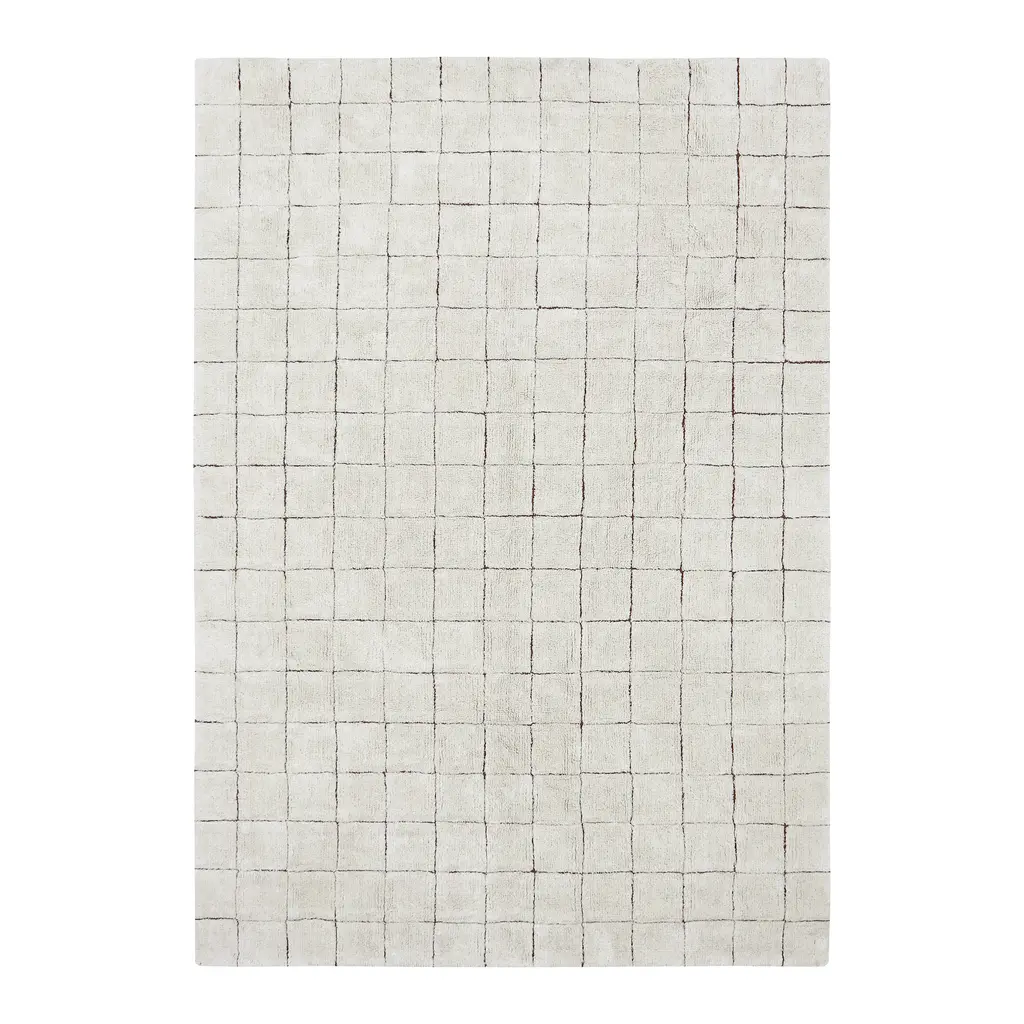 Inspired by traditional vintage ceramic floors, the Mosaic rug features a checkered pattern in natural color on top of a Toffee color canvas base slightly showing through in between the squares, simulating the tiles of a kitchen floor. Features