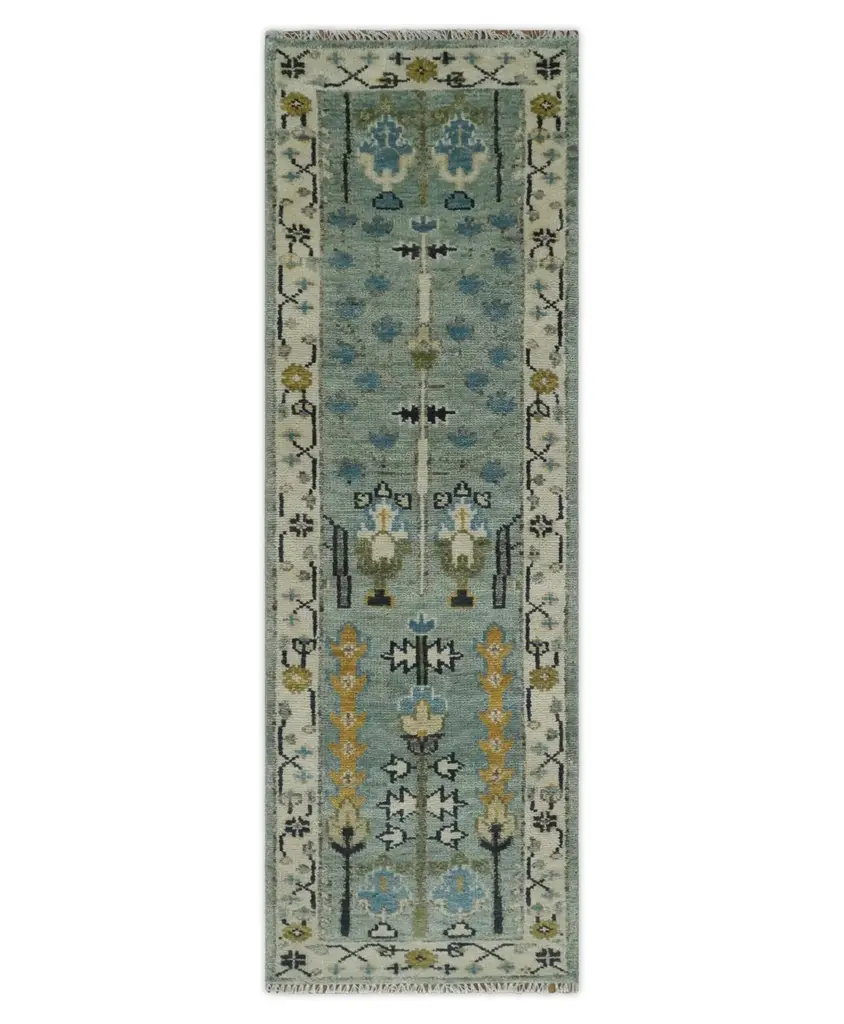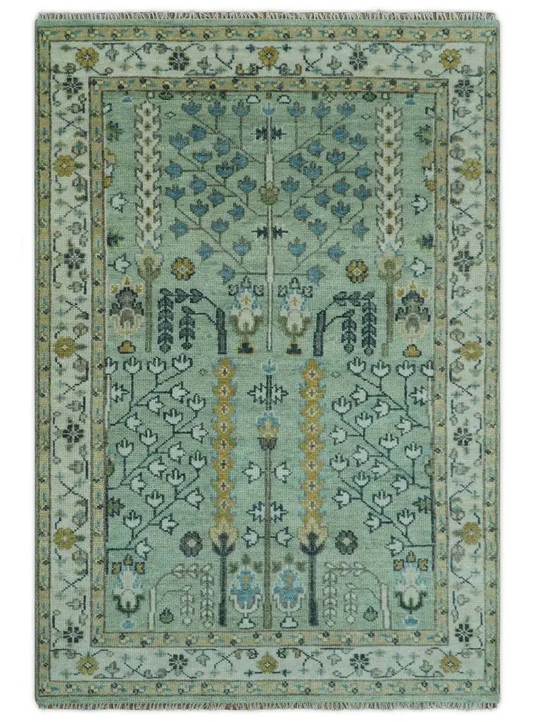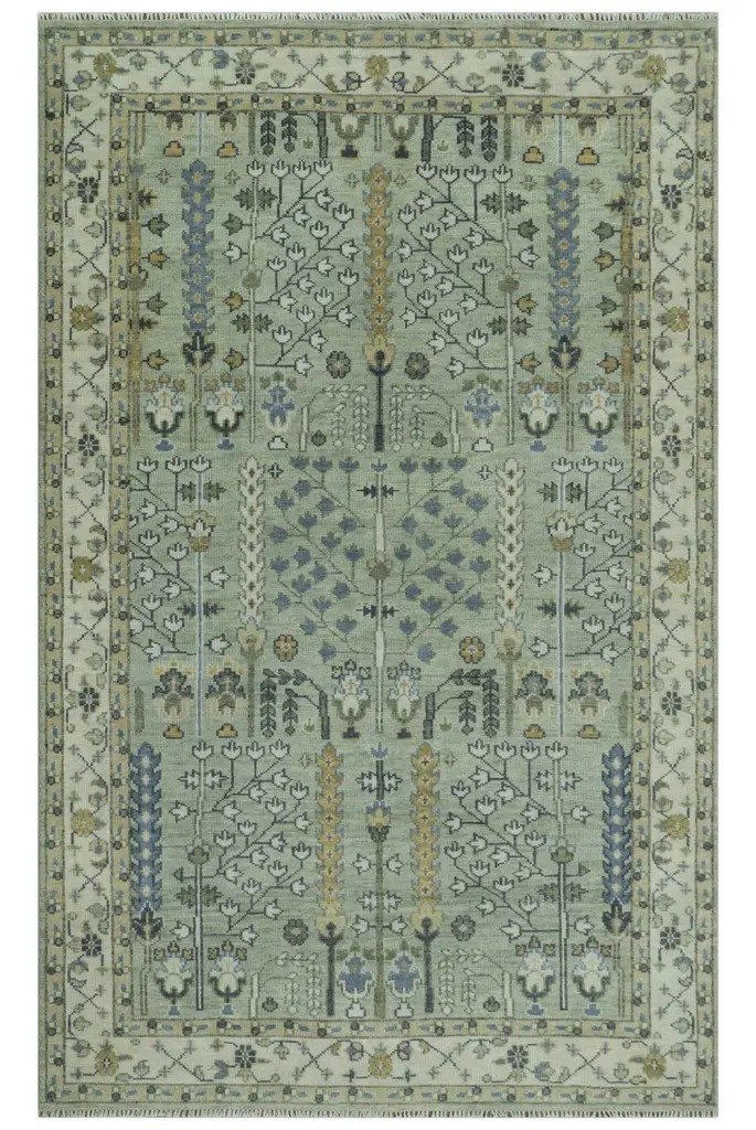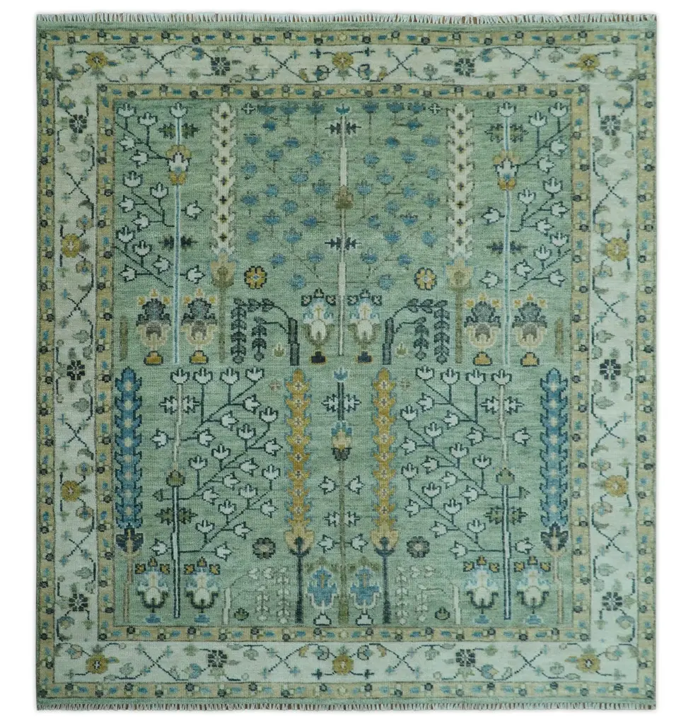 This luxurious rug showcases a sophisticated palette of soft celadon green, deep navy, and warm ochre, accented by delicate ivory highlights. Intricate tree-like and floral motifs form a harmonious medley of traditional elegance. The symmetrical design is bordered by a classic frame adorned with geometric vines and blossoms, suggesting Persian influences. Its texture is plush and inviting, crafted from premium materials for a refined finish. A stunning piece that effortlessly blends cultural richness with contemporary style. Product Details Color: Moss Green and Ivory Design: Turkish "Tree of Life" with floral and vine motifs Material: 100% Wool Construction: Hand-Knotted Knots Per Inch (KPI): 22 Availability: Made to order (30-45 days) Durability: Highly durable, ideal for high-traffic areas Size Options: Available in 90+ sizes & custom sizing Care Guide Vacuum your rug regularly and shake it to remove dust Avoid prolonged exposure to moisture Blot spills immediately with a white cloth Use scissors to trim loose threads instead of pulling them Avoid harsh chemicals to maintain the color vibrancy of your rug Place rug protectors under heavy furniture to prevent indentations