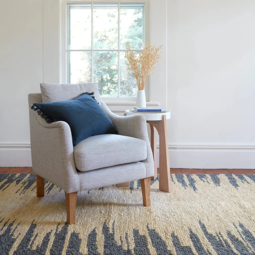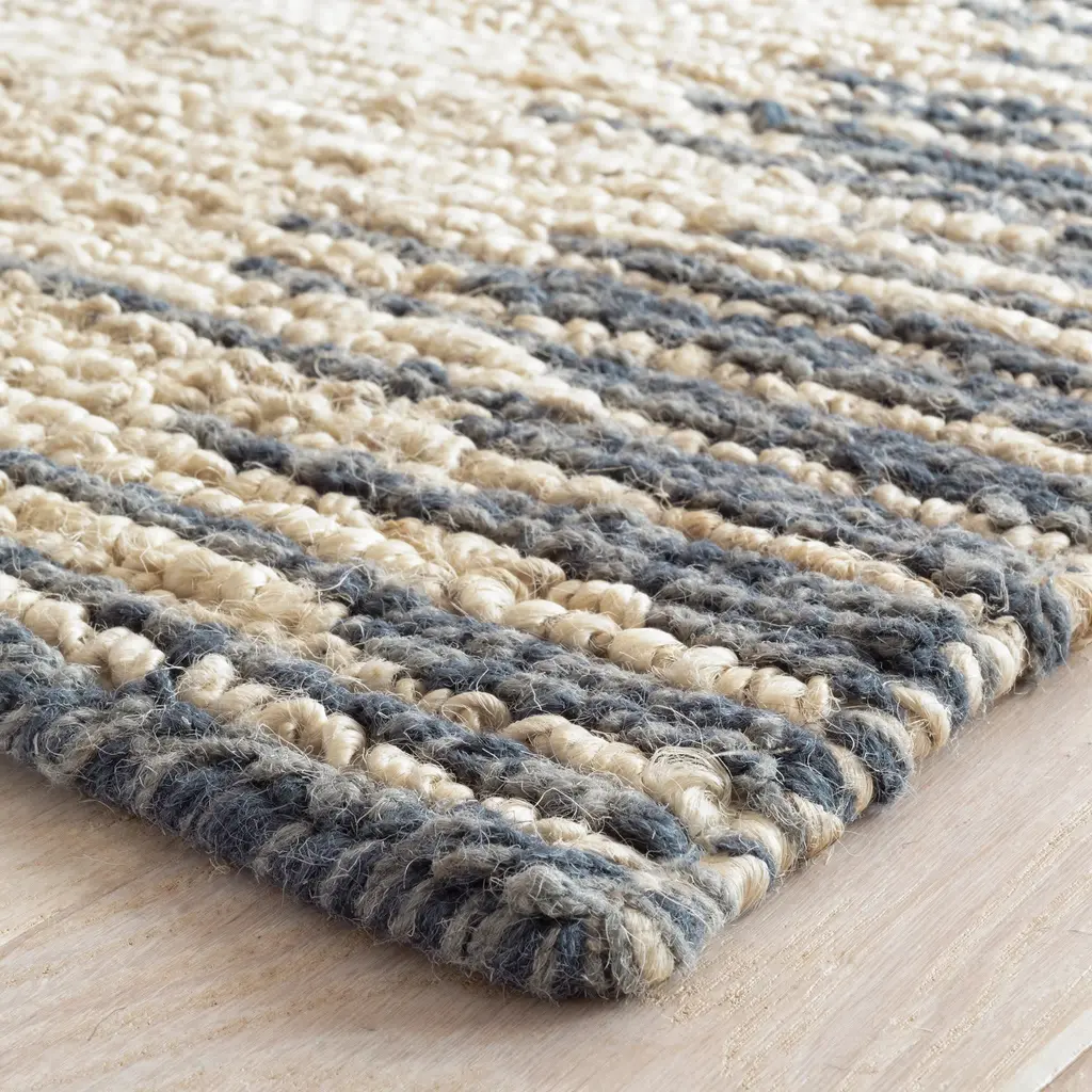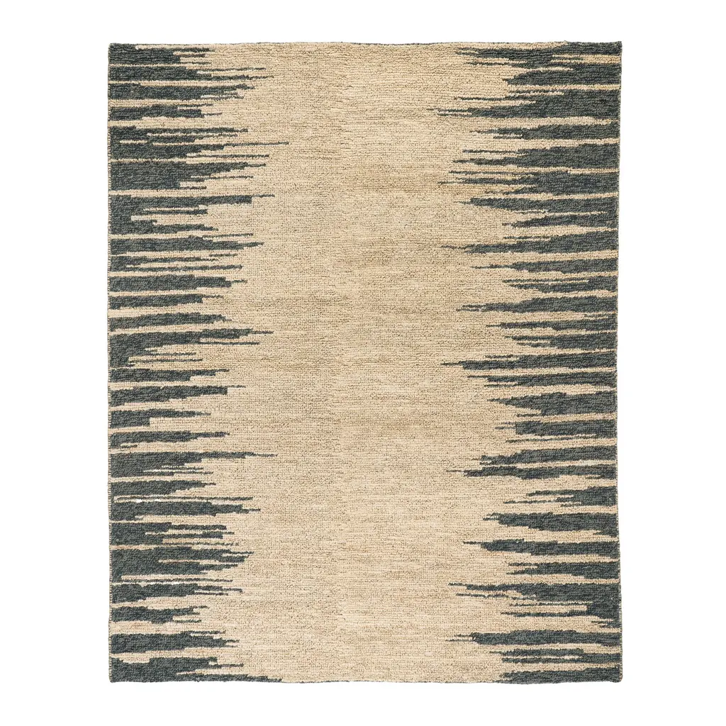 Enjoy the natural beauty of sustainable jute. The burly yarn, densely woven as stubby twisted loops, creates a uniquely random central panel contrasting in color and texture with soft wool borders in earthy mineral shades. Part of a collection designed by Marie Flanigan, the Founder and Principal of Marie Flanigan Interiors.