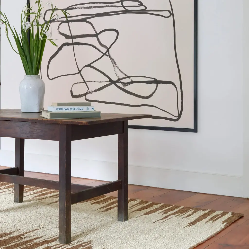 Enjoy the natural beauty of sustainable jute. The burly yarn, densely woven as stubby twisted loops, creates a uniquely random central panel contrasting in color and texture with soft wool borders in earthy mineral shades. Part of a collection designed by Marie Flanigan, the Founder and Principal of Marie Flanigan Interiors.