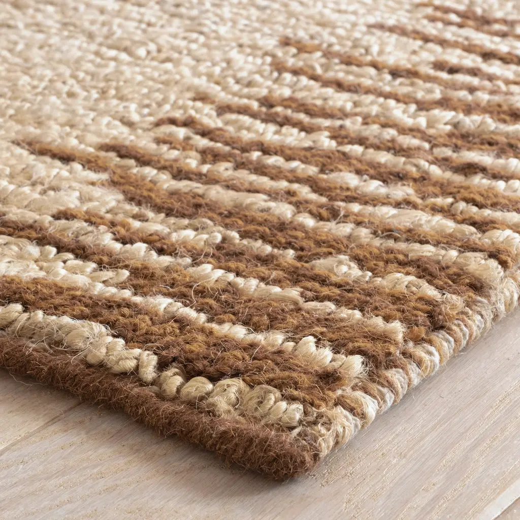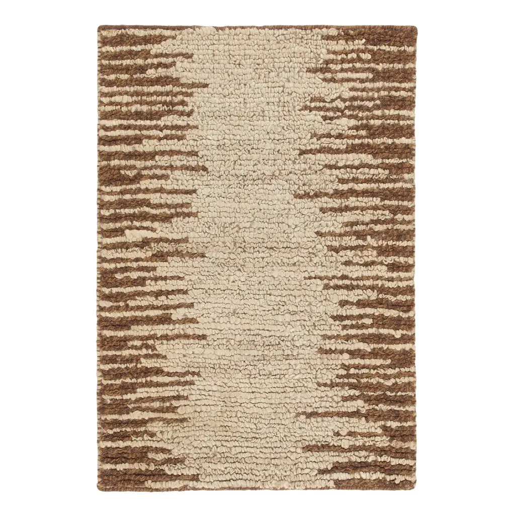 Enjoy the natural beauty of sustainable jute. The burly yarn, densely woven as stubby twisted loops, creates a uniquely random central panel contrasting in color and texture with soft wool borders in earthy mineral shades. Part of a collection designed by Marie Flanigan, the Founder and Principal of Marie Flanigan Interiors.