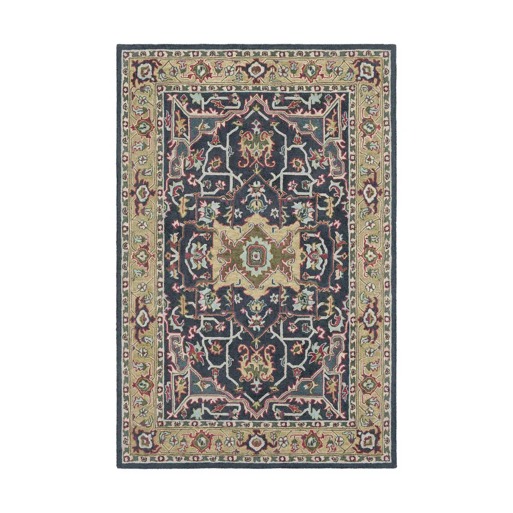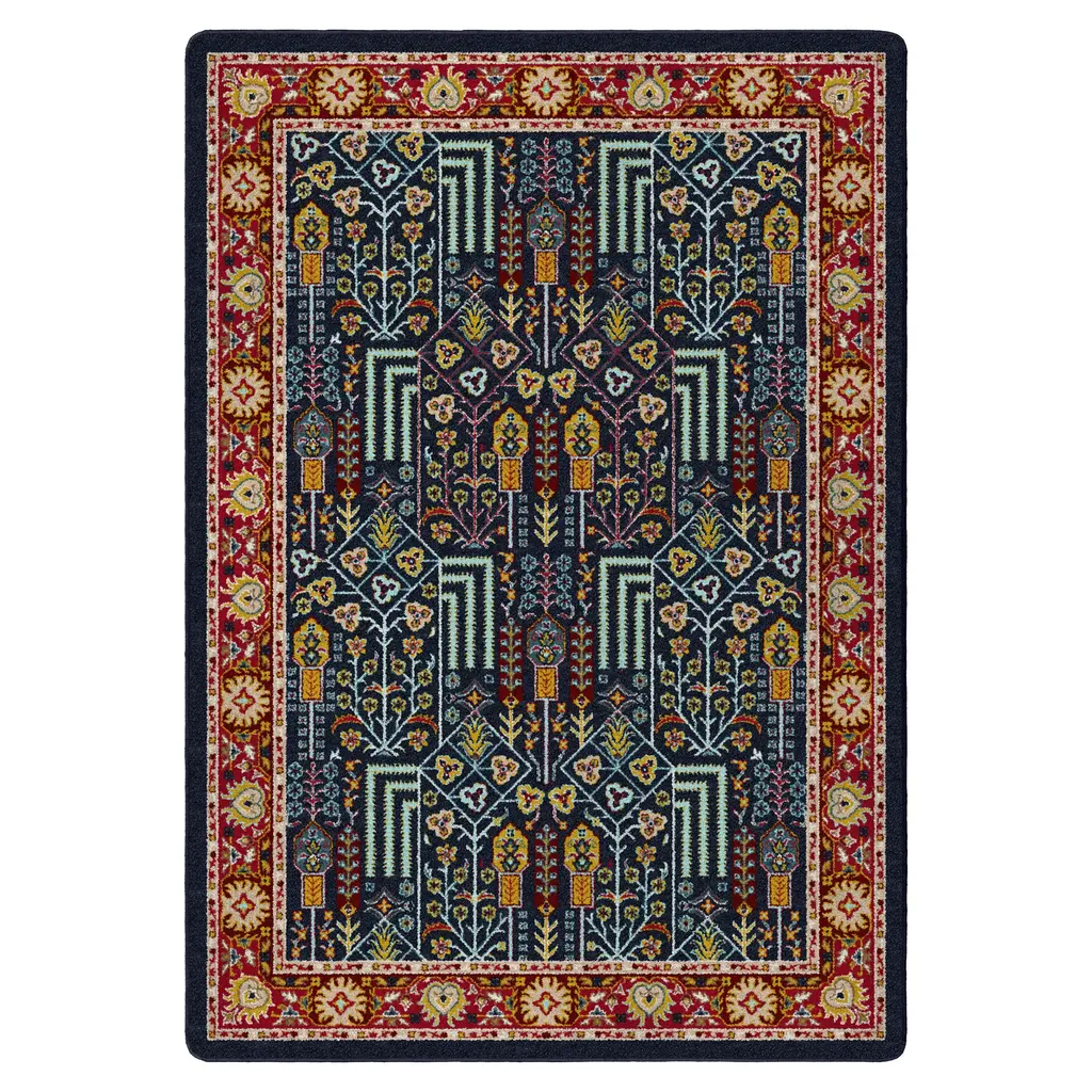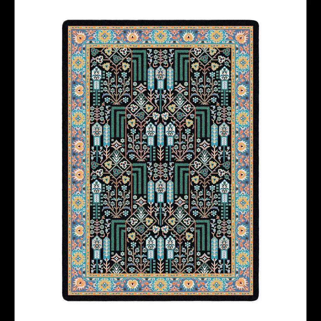 This folk art style Mount Joy EnduraStran Area Rug features jewel tones that pop against a black background. It’s the perfect blend of elegance and durability, at home in any home from modern to traditional. Made of commercial-grade EnduraStran, this area rug is fade-, fire- and stain-resistant, perfect for homes with kids, pets and lots of foot traffic. No worries about muddy paws or spills; rug is anti-microbial and cleans easily with just water! Lok-Bak™ technology ensures that the rug lays flat; won’t bunch or buckle. Serged edges offer maximum durability. Use with a rug pad. Design varies slightly by size. Sizes are approximate. Pile is approx. 1"H. Easy care, spot clean with water. Made in USA.