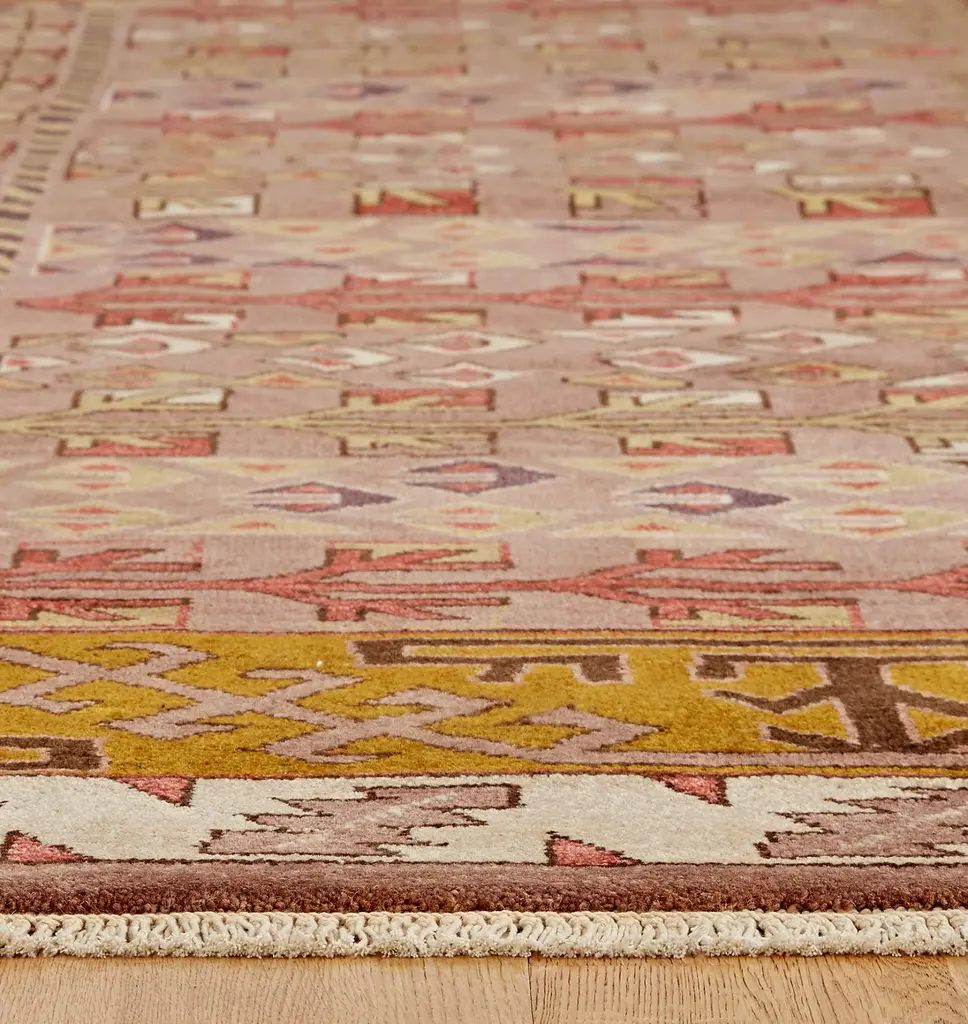 Details You'll Appreciate A high luster wash leaves this rug with a subtle sheen that will add nuances to yarn color depending on your angle Crafted 100% by hand using a hand-knotted technique Product Specifications 100% wool Density of 48 knots per inch Pile height of approximately 3/8" Scale of motifs, pattern, and borders will adapt according to rug size Corner swatch represents 8" x 10" motif Use of a rug pad is recommended For indoor use only Made in India Care Instructions Blot spills immediately with a clean colorfast towel or sponge. Air dry. Dry clean professionally. To prevent fading, keep fabric out of direct sunlight.