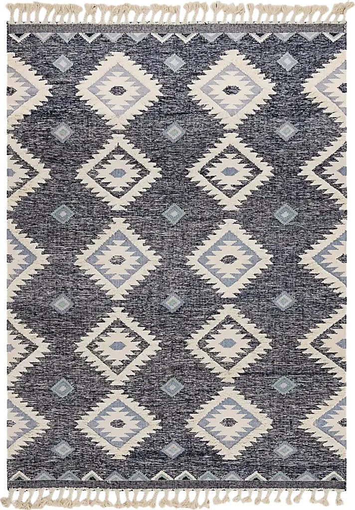 The geometric tribal pattern of the Mulde Collection brings an exciting southwestern flair to any room. The woven construction contrasts with raised areas and fringe for even more visual interest. The subdued color palettes and transitional design keep it from becoming too overbearing whether in a modern or traditional style room.