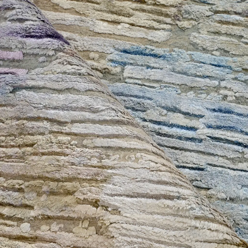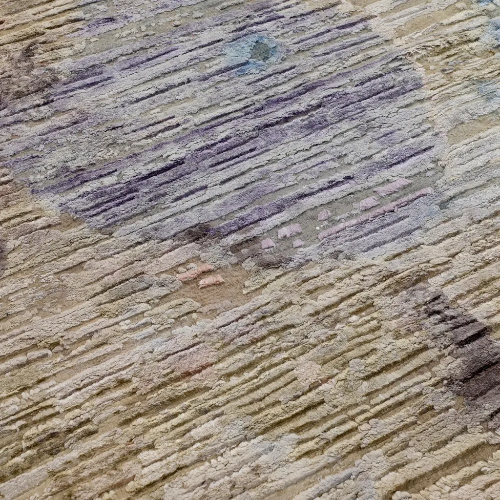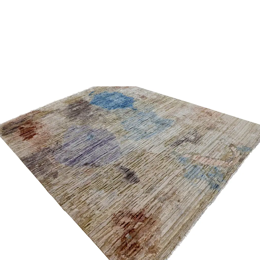 This contemporary area rug measures 8'1" x 9'8", offering a substantial foundation for various room layouts. It features a multicolored abstract design, blending tones of blue, purple, rust, and muted earth tones on a light, textured background. The pattern consists of soft, organic color fields that appear subtly diffused, creating a visual depth that complements modern interiors. Crafted from a durable wool and silk blend, this rug combines the natural resilience and insulating properties of wool with the soft luster and smooth feel of silk. This material choice results in a surface that is both long-lasting and comfortable underfoot. The rug is a product of India, reflecting traditional craftsmanship. Designed for contemporary settings, this rug can serve as a focal point in a living room, define a dining area, or add a layer of texture and color to a bedroom or office. Its versatile color palette allows for integration with a range of existing decor schemes, while its unique pattern provides a distinct artistic touch. The wool silk blend naturally contributes to sound absorption and warmth within a space.