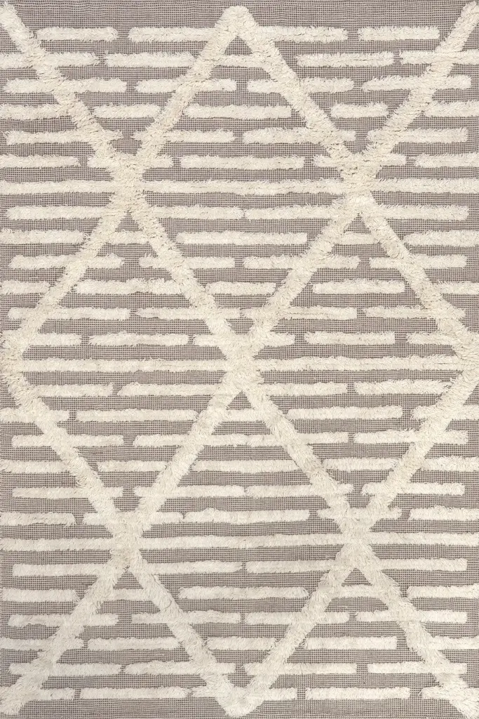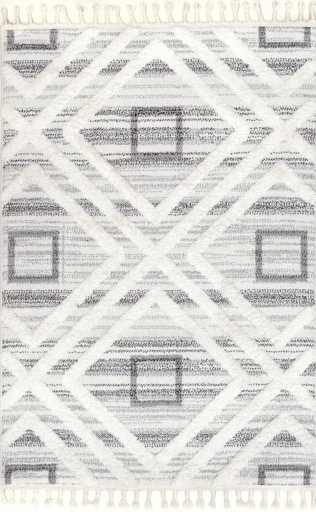 Collection: Mynka Colors: Gray, Ivory Construction: Machine Made Material: Face: 100%Polyester / Warp: Jute Pile: High Pile Pile Height: 1.3" Styles: Transitional,Bohemian & Eclectic,Farmhouse Backing: Jute Made In: Turkey Thickness: 1.3" Price Range: $$$$$ (Affordable)