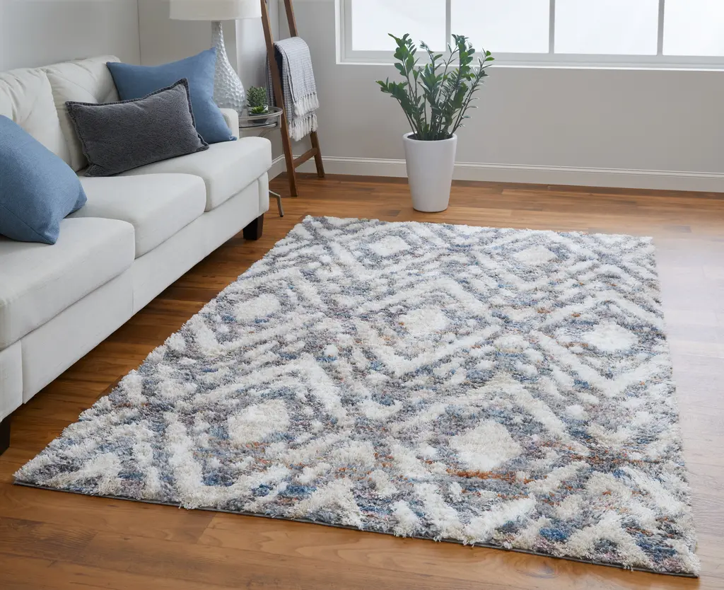 Collection: Mynka Colors: Ivory, Gray, Taupe Construction: Machine Made Material: Face: 100%Polyester / Warp: Jute Pile: High Pile Pile Height: 1.3" Styles: Transitional,Bohemian,Mid-Century Modern Backing: Jute Made In: Turkey Thickness: 1.3" Price Range: $$$$$ (Affordable)