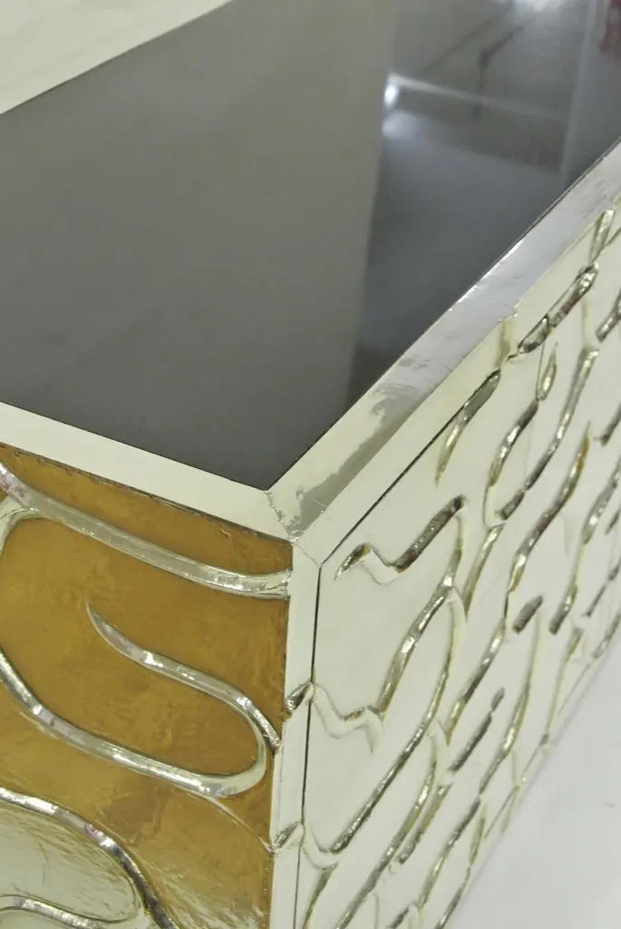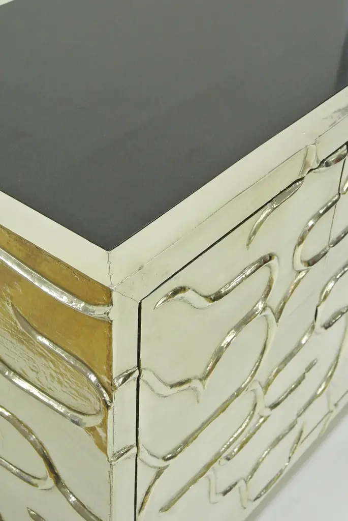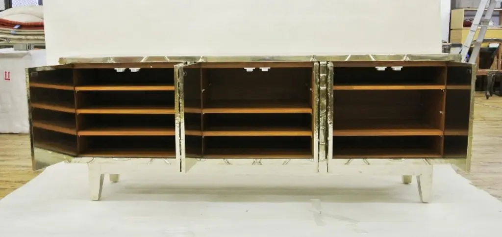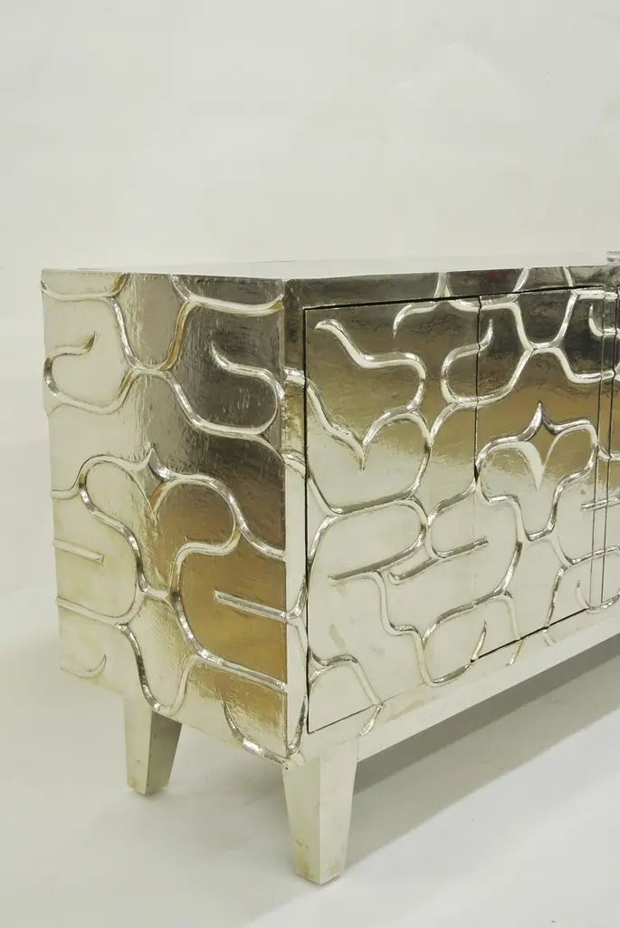 A remarkable piece in which each of the exterior faces is entirely sculpted out of a solid piece of wood by hand, creating a design inspired from one of Stephanie Odegard's rug designs. It is then covered with metal sheeting. The available options for metal cladding are brass, white bronze, antiqued bronze, silver and copper. Both silver and copper will tarnish over time. Regular non-abrasive household metal polishes can be used to restore the original finish.Mystique Credenza in BrassSize- 80" x 18" x 30.5"HMaterials - Brass, Teak, Cast, Hand-CraftedPlease note that moisture in air, sudden change in temperature and natural movement of wood over time causes the metal to wrinkle or bubble up. We use well seasoned, reclaimed teak and high quality marine grade MDF (wherever technically possible) to avoid and delay the above mentioned changes. However a perfect stability of metal cannot be guaranteed.Buyer Cancellation-The cancellation charge is 25% which increases to 50% if the production is started.Prices do not include shipping from India (for custom orders) or our MN warehouse (items from stock). That will be additional.