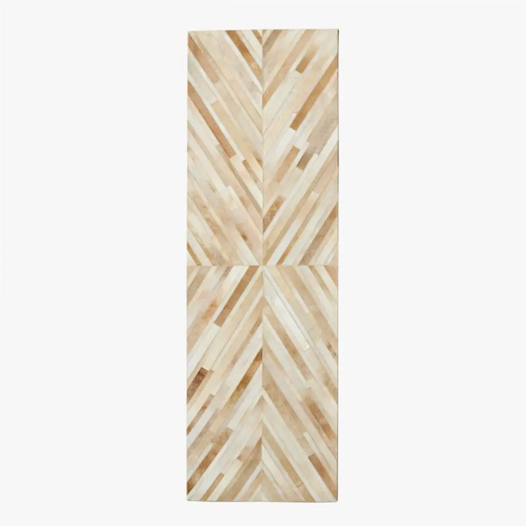 Geometric diamond design by Bryn Namavari imbues this natural hide rug with sleek drama. Sand-colored cowhide leather is pieced by hand and carefully stitched to highlight the beauty of this natural material. Lays soft and is ideal for low-traffic areas. CB2 exclusive.How will it look in your room? 12"x12" rug samples are available in stores for a fee refundable upon return of the sample.