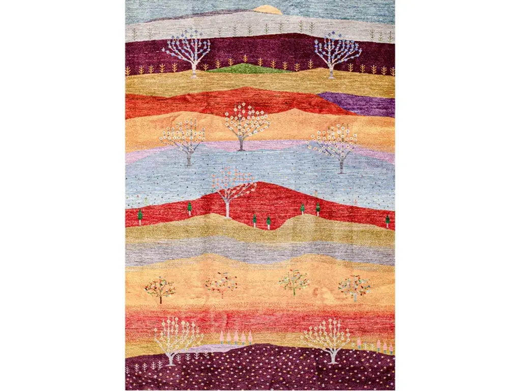 Naïve Orchard at Dusk 1 is a rectangular wool rug.Zollanvari Super Fine Gabbeh.Trees, flowers and animals (principally lions) are design themes that are used by tribal women to weave some of Zollanvari’s most original Gabbehs. The weavers are given patterns and colour ranges (often inspired by ancient and archaic patterns such as the ‘Tree of Life’) but have a free hand in producing these works of woven art using their imaginations and the traditional design vocabulary passed down through each new generation of weavers. This makes each Gabbeh unique and individual. Flora & Fauna design Gabbehs are also available in Zollanvari Super Fine (Kashkuli, Luribaft and Bulurbaft) and Zollanvari Fine qualities.The designs are available in custom and bespoke sizes and colours.