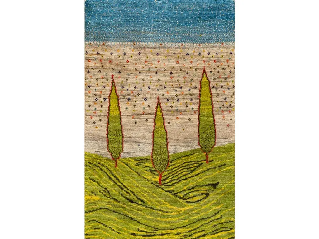 Naïve Orchard with Flowering Bushes 1 is a rectangular wool rug.Zollanvari Super Fine Gabbeh.Trees, flowers and animals (principally lions) are design themes that are used by tribal women to weave some of Zollanvari’s most original Gabbehs. The weavers are given patterns and colour ranges (often inspired by ancient and archaic patterns such as the ‘Tree of Life’) but have a free hand in producing these works of woven art using their imaginations and the traditional design vocabulary passed down through each new generation of weavers. This makes each Gabbeh unique and individual. Flora & Fauna design Gabbehs are also available in Zollanvari Super Fine (Kashkuli, Luribaft and Bulurbaft) and Zollanvari Fine qualities.The designs are available in custom and bespoke sizes and colours.