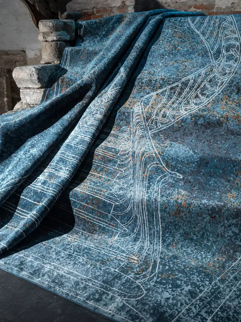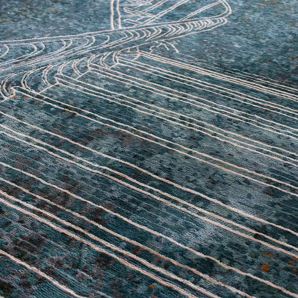 Material: Wool, SilkKnot Density: 150 knots/inch²Pile Height: 4mmTechnique: Hand-knottedCustom sizes and colors on requestThe La Scala collection was inspired by Mike Shilov's admiration for Italian architecture, particularly the beauty and variety of staircases as architectural elements.The collection is the result of research into the different functions of this element, from ancient times to modern and contemporary styles, from celebratory, scenic, and monumental functions, neoclassical and baroque to modern architecture. The design in the collection reduces the element to its essentiality of outlines that gravitate into a metaphysical space in the shades of different terrestrial and non-terrestrial, complex color combinations. All rugs in the collection have a knot density of 150 knots/inch², a pile height of 4mm, and a variable combination of precious wool and silk.The Venezia Celeste Rug is made of 18% wool and 82% silk, available in four sizes and custom-made