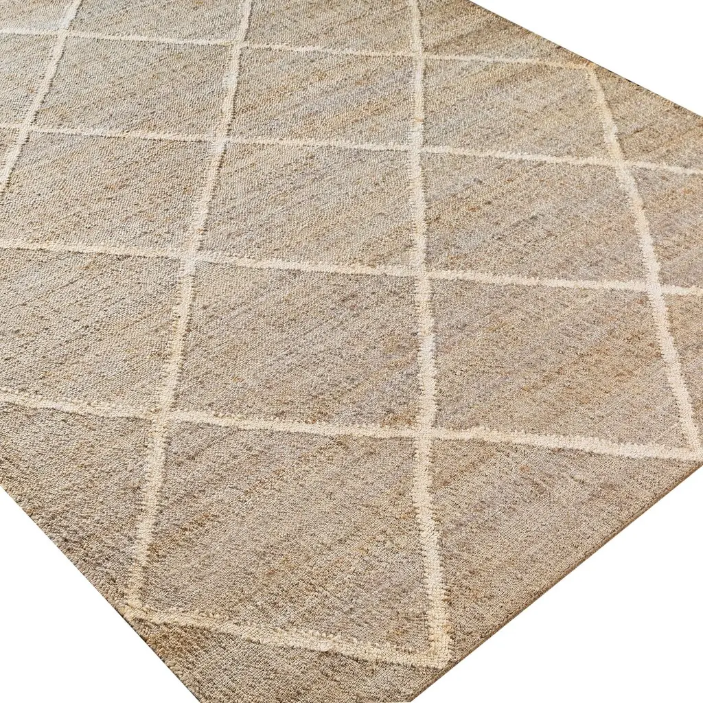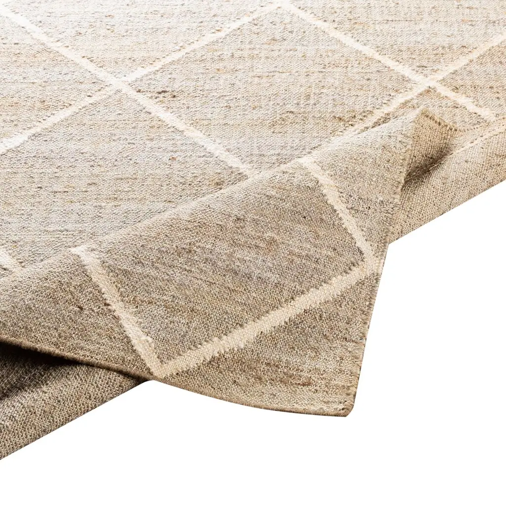 The pale geometric motif calls attention to the wonderful variety of tones in this rug's background. It's handwoven of jute, among the softest of the natural fibers used for rugs. A rug pad is recommended to prevent slipping and extend the life of the rug.