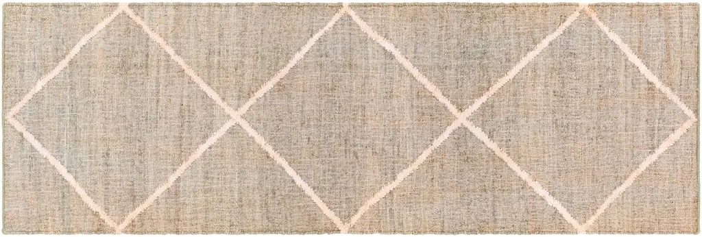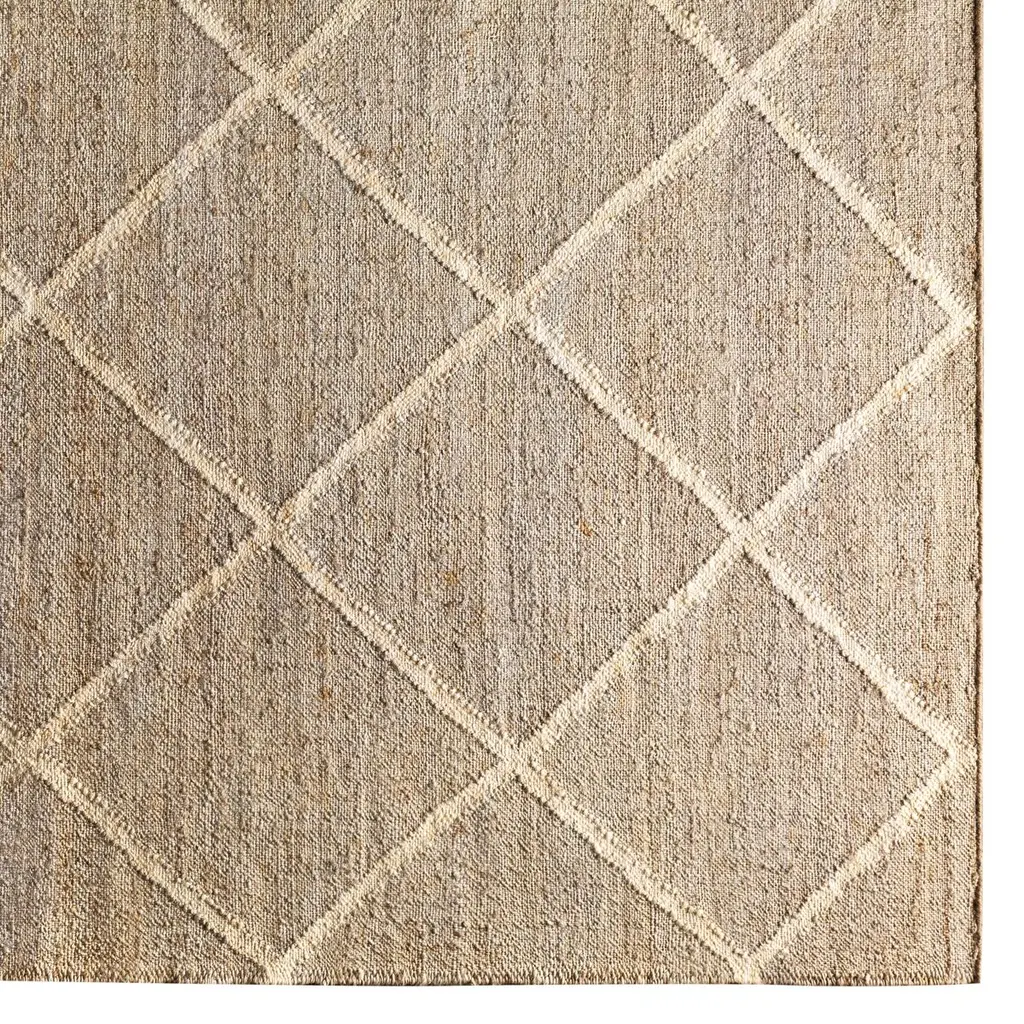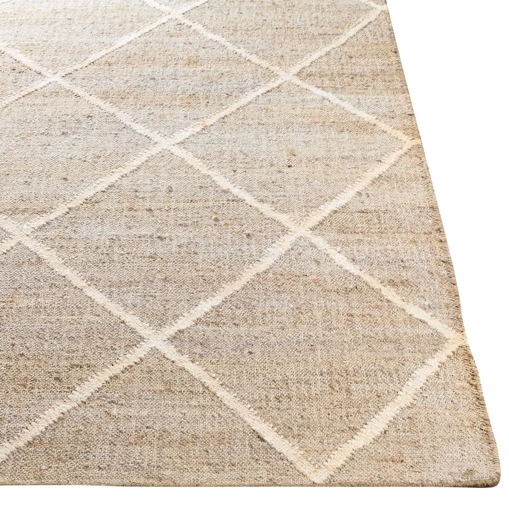 The pale geometric motif calls attention to the wonderful variety of tones in this rug's background. It's handwoven of jute, among the softest of the natural fibers used for rugs. A rug pad is recommended to prevent slipping and extend the life of the rug.