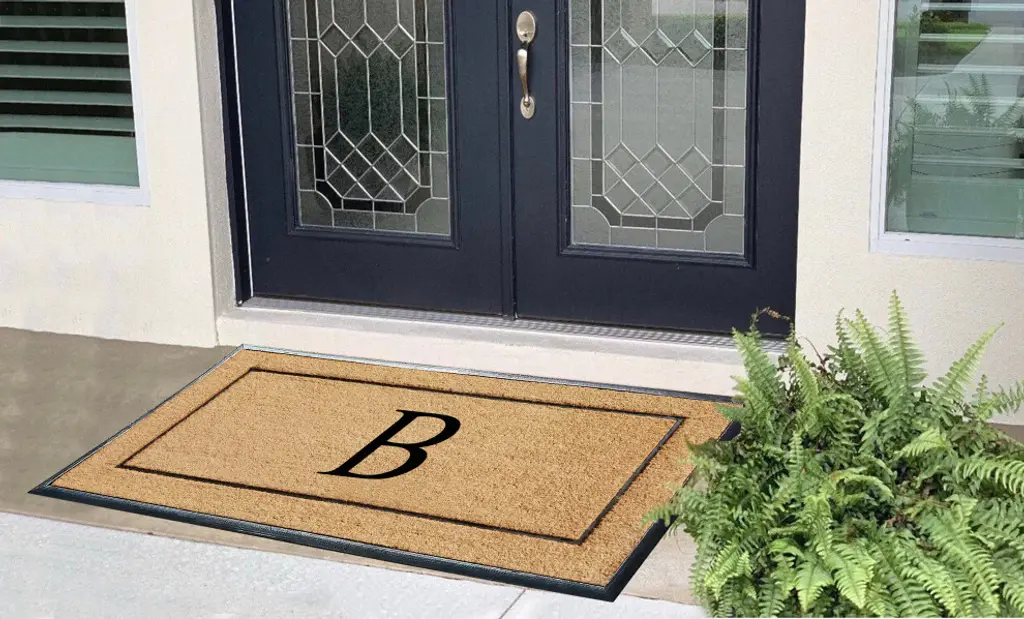 More than a decorative enhancement this rubber & coir molded monogrammed doormat is made with a heavy rubber backing that anchors it in place while you brush dirt & debris from shoes & boots. The tufted coco-fiber facilitates scrubbing soles clean. Keeps your floor clean when you decorate your entryway with this beautiful doormat, which includes a sturdy rubber backing to help in keep the mat in place & prevent slips. The attractive design of this Coir Door Mat creates a welcoming entrance for your guests & the durable coir material holds up to lots of foot traffic. This Welcome Mat Recommended for outdoor use in covered areas. Vacuum or shake the mat regularly for longer life.>NEWLY DEVELOPED RUBBER AND COIR MONOGRAMMED DOOR MAT: This is a completely newly designed door mat, suitable for double doors. The large size outdoor front door mats are made of Natural coir fiber and high-quality rubber. This coir door mat has a large coir area to clean and wipe your shoes which keeps your house clean. Rubber and Coir door mats are stronger and more durable lasting longer than regular door mats.>HEAVY DOOR MAT WITH TAPERED EDGE: This large doormat for outdoor entrance is heavy enough not to easily get blown away. It has tapered edges which eliminates the risk of tripping. This is a unique feature to this door mat and adds to your safety.>PERFECT SIZE DOOR MAT: 30 X 60 inches(nominal size) makes a great size and the door mat more functional. This size fits very well with any double or even a single door. Use this large outdoor mat on a front or back door, patio, in a garage, any other entryway where there is high traffic from outside.>SUPER TOUGH DOOR MAT: Constructed with thick coir bristles on the topside with rubber base, the welcome mat outdoor is built tough ; its strong bristles create a wiping area and the rubber base adds to the sturdiness. This premium outdoor rug will help stop dirt, debris, moisture and other particles from being tracked into your home and will last much longer than regular door mats.>ENVIRONMENT FRIENDLY OUTDOOR RUG: Made from 100% Hard Wearing Coir Eco friendly Rubber base. These doormats are completely Made with Natural Fibers and Rubber. Adds a unique touch to your front door or back door while being very functional.>ATTRACTIVE DESIGN AND ANTI SHED TREATED FRONT DOOR MAT: This is a personalized designed door mat and every door mat is Hand monogrammed individually in the USA. The coir portion of this door mat is treated with Anti Shed dyes to minimize shedding.>UNIQUE GIFT IDEA THEY WON"™T FORGET: Looking for birthday gifts for mom, housewarming gifts for new homeowners, wedding gifts for bride and groom, or hostess gifts for women who have everything?>USE THESE WELCOME MATS IN COVERED OUTDOOR AREAS ONLY: Do not expose directly to sunlight or rain. During this time brush (with soft brush), use a leaf blower, or shake the mat to maintain its best appearance.