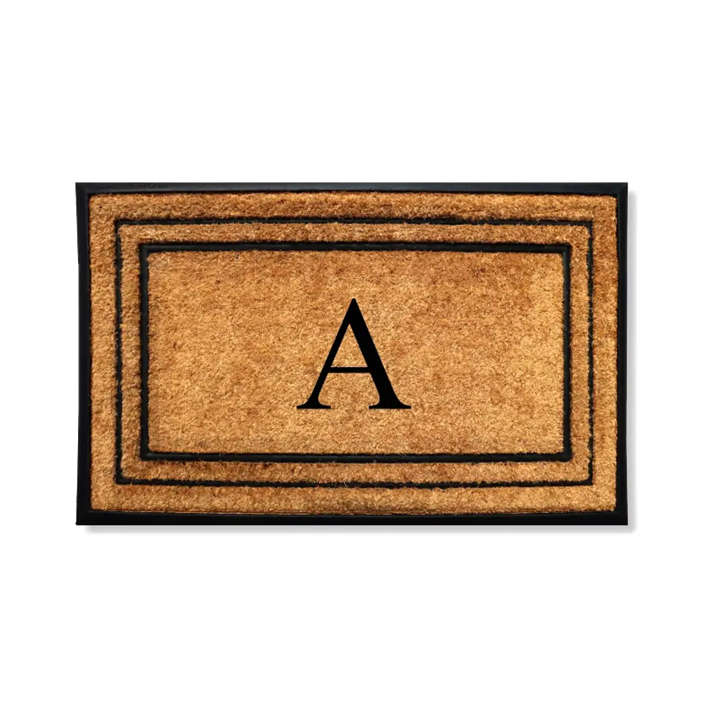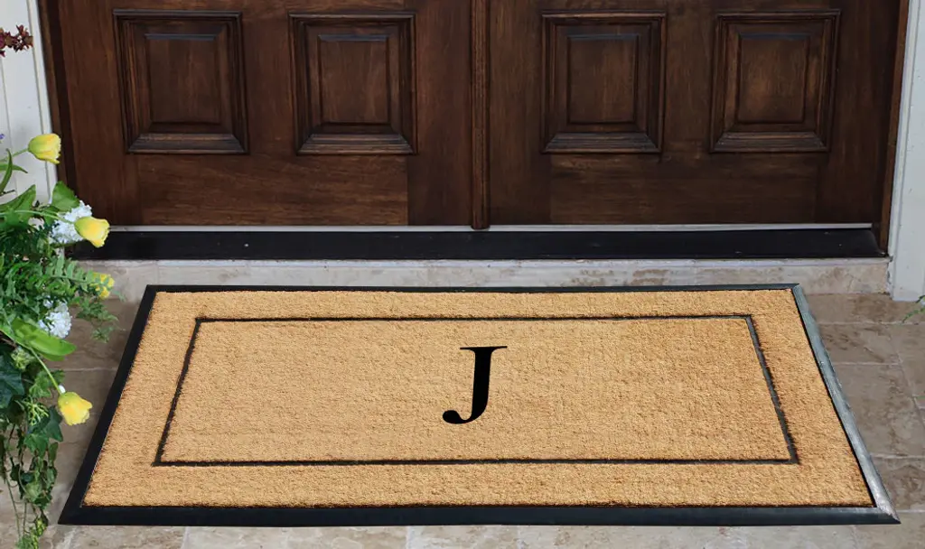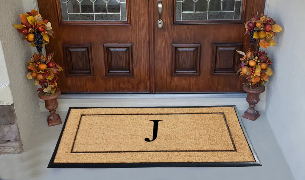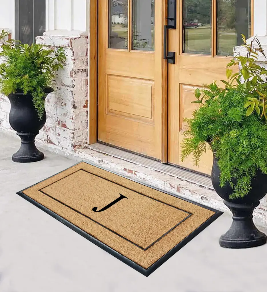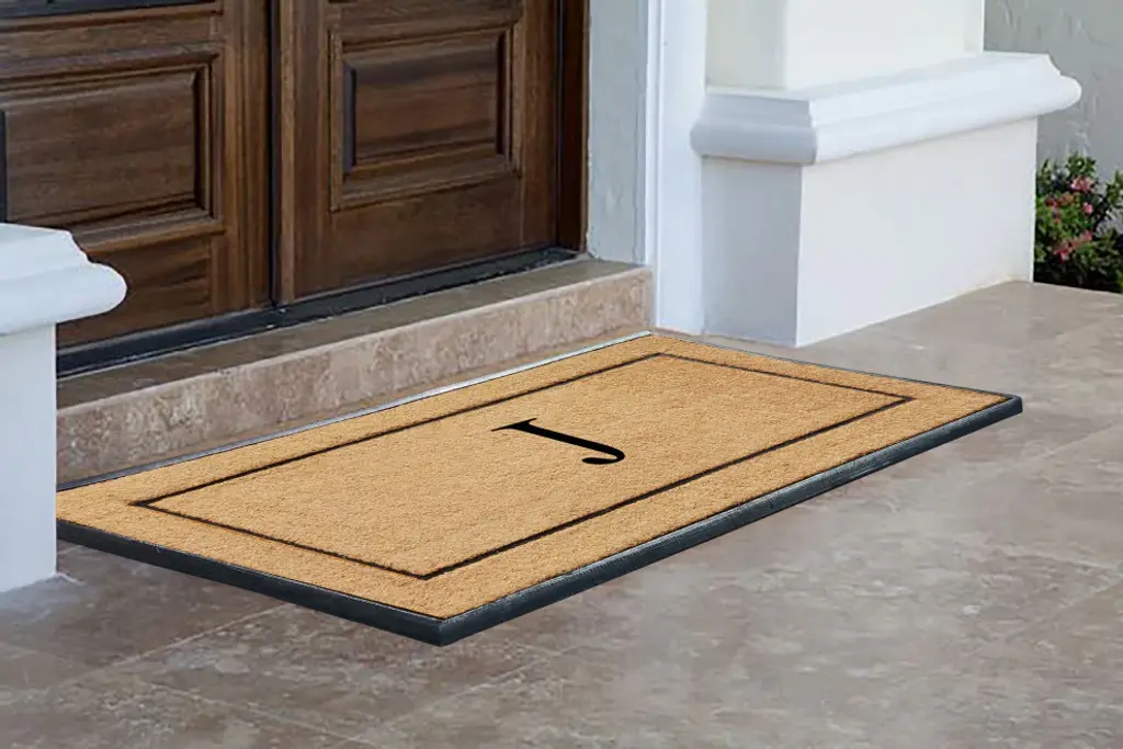 More than a decorative enhancement this rubber & coir molded monogrammed doormat is made with a heavy rubber backing that anchors it in place while you brush dirt & debris from shoes & boots. The tufted coco-fiber facilitates scrubbing soles clean. Keeps your floor clean when you decorate your entryway with this beautiful doormat, which includes a sturdy rubber backing to help in keep the mat in place & prevent slips. The attractive design of this Coir Door Mat creates a welcoming entrance for your guests & the durable coir material holds up to lots of foot traffic. This Welcome Mat Recommended for outdoor use in covered areas. Vacuum or shake the mat regularly for longer life.>NEWLY DEVELOPED RUBBER AND COIR MONOGRAMMED DOOR MAT: This is a completely newly designed door mat, suitable for double doors. The large size outdoor front door mats are made of Natural coir fiber and high-quality rubber. This coir door mat has a large coir area to clean and wipe your shoes which keeps your house clean. Rubber and Coir door mats are stronger and more durable lasting longer than regular door mats.>HEAVY DOOR MAT WITH TAPERED EDGE: This large doormat for outdoor entrance is heavy enough not to easily get blown away. It has tapered edges which eliminates the risk of tripping. This is a unique feature to this door mat and adds to your safety.>PERFECT SIZE DOOR MAT: 30 X 60 inches(nominal size) makes a great size and the door mat more functional. This size fits very well with any double or even a single door. Use this large outdoor mat on a front or back door, patio, in a garage, any other entryway where there is high traffic from outside.>SUPER TOUGH DOOR MAT: Constructed with thick coir bristles on the topside with rubber base, the welcome mat outdoor is built tough ; its strong bristles create a wiping area and the rubber base adds to the sturdiness. This premium outdoor rug will help stop dirt, debris, moisture and other particles from being tracked into your home and will last much longer than regular door mats.>ENVIRONMENT FRIENDLY OUTDOOR RUG: Made from 100% Hard Wearing Coir Eco friendly Rubber base. These doormats are completely Made with Natural Fibers and Rubber. Adds a unique touch to your front door or back door while being very functional.>ATTRACTIVE DESIGN AND ANTI SHED TREATED FRONT DOOR MAT: This is a personalized designed door mat and every door mat is Hand monogrammed individually in the USA. The coir portion of this door mat is treated with Anti Shed dyes to minimize shedding.>UNIQUE GIFT IDEA THEY WON"™T FORGET: Looking for birthday gifts for mom, housewarming gifts for new homeowners, wedding gifts for bride and groom, or hostess gifts for women who have everything?>USE THESE WELCOME MATS IN COVERED OUTDOOR AREAS ONLY: Do not expose directly to sunlight or rain. During this time brush (with soft brush), use a leaf blower, or shake the mat to maintain its best appearance.