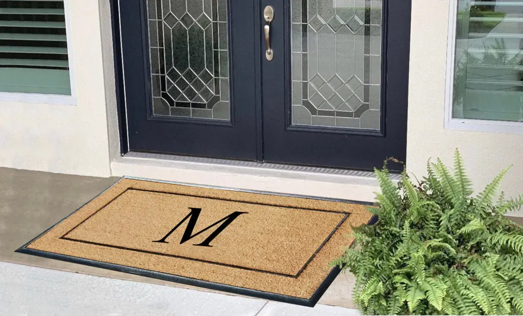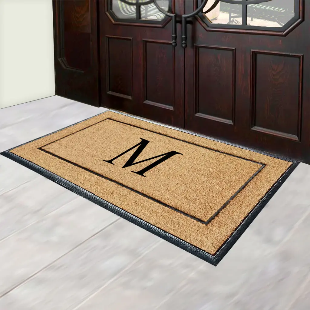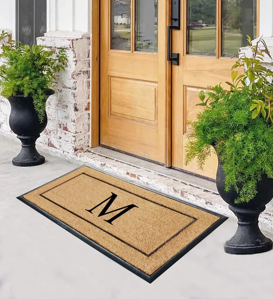 More than a decorative enhancement this rubber & coir molded monogrammed doormat is made with a heavy rubber backing that anchors it in place while you brush dirt & debris from shoes & boots. The tufted coco-fiber facilitates scrubbing soles clean. Keeps your floor clean when you decorate your entryway with this beautiful doormat, which includes a sturdy rubber backing to help in keep the mat in place & prevent slips. The attractive design of this Coir Door Mat creates a welcoming entrance for your guests & the durable coir material holds up to lots of foot traffic. This Welcome Mat Recommended for outdoor use in covered areas. Vacuum or shake the mat regularly for longer life.>NEWLY DEVELOPED RUBBER AND COIR MONOGRAMMED DOOR MAT: This is a completely newly designed door mat, suitable for double doors. The large size outdoor front door mats are made of Natural coir fiber and high-quality rubber. This coir door mat has a large coir area to clean and wipe your shoes which keeps your house clean. Rubber and Coir door mats are stronger and more durable lasting longer than regular door mats.>HEAVY DOOR MAT WITH TAPERED EDGE: This large doormat for outdoor entrance is heavy enough not to easily get blown away. It has tapered edges which eliminates the risk of tripping. This is a unique feature to this door mat and adds to your safety.>PERFECT SIZE DOOR MAT: 30 X 60 inches(nominal size) makes a great size and the door mat more functional. This size fits very well with any double or even a single door. Use this large outdoor mat on a front or back door, patio, in a garage, any other entryway where there is high traffic from outside.>SUPER TOUGH DOOR MAT: Constructed with thick coir bristles on the topside with rubber base, the welcome mat outdoor is built tough ; its strong bristles create a wiping area and the rubber base adds to the sturdiness. This premium outdoor rug will help stop dirt, debris, moisture and other particles from being tracked into your home and will last much longer than regular door mats.>ENVIRONMENT FRIENDLY OUTDOOR RUG: Made from 100% Hard Wearing Coir Eco friendly Rubber base. These doormats are completely Made with Natural Fibers and Rubber. Adds a unique touch to your front door or back door while being very functional.>ATTRACTIVE DESIGN AND ANTI SHED TREATED FRONT DOOR MAT: This is a personalized designed door mat and every door mat is Hand monogrammed individually in the USA. The coir portion of this door mat is treated with Anti Shed dyes to minimize shedding.>UNIQUE GIFT IDEA THEY WON"™T FORGET: Looking for birthday gifts for mom, housewarming gifts for new homeowners, wedding gifts for bride and groom, or hostess gifts for women who have everything?>USE THESE WELCOME MATS IN COVERED OUTDOOR AREAS ONLY: Do not expose directly to sunlight or rain. During this time brush (with soft brush), use a leaf blower, or shake the mat to maintain its best appearance.