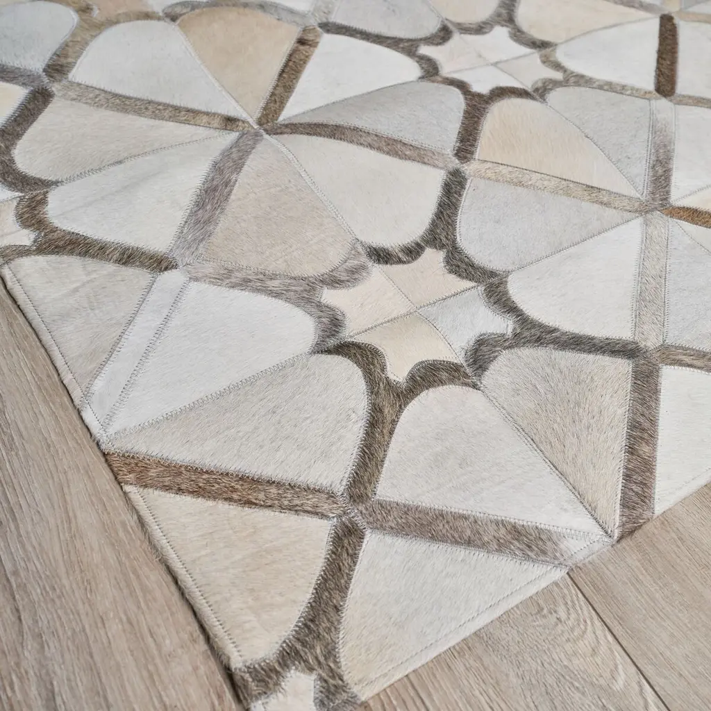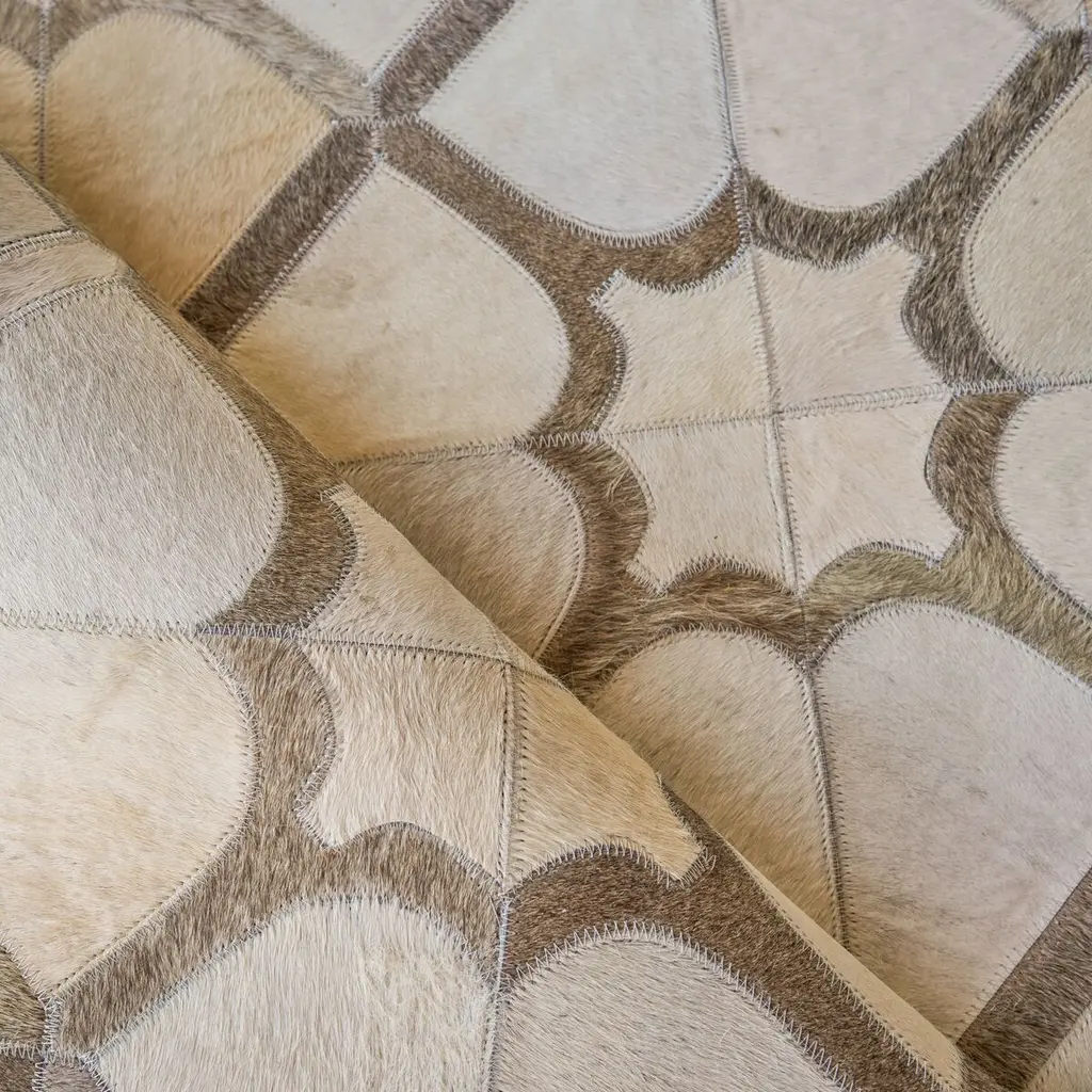 Pieces of hair-on cowhide were stitched together to create this handcrafted rug's eye-catching motif. The variety of tones gives the rug a luxurious sense of depth and make it as much a work of art as it is a practical floor covering. A rug pad is recommended to help prevent slipping.
