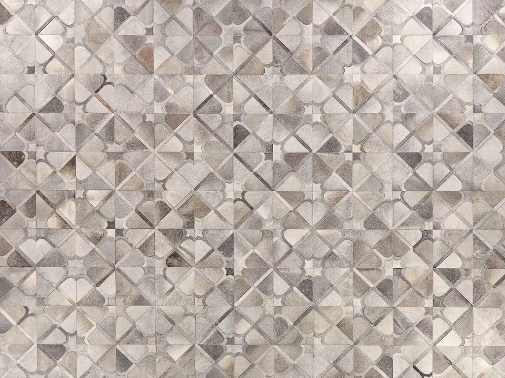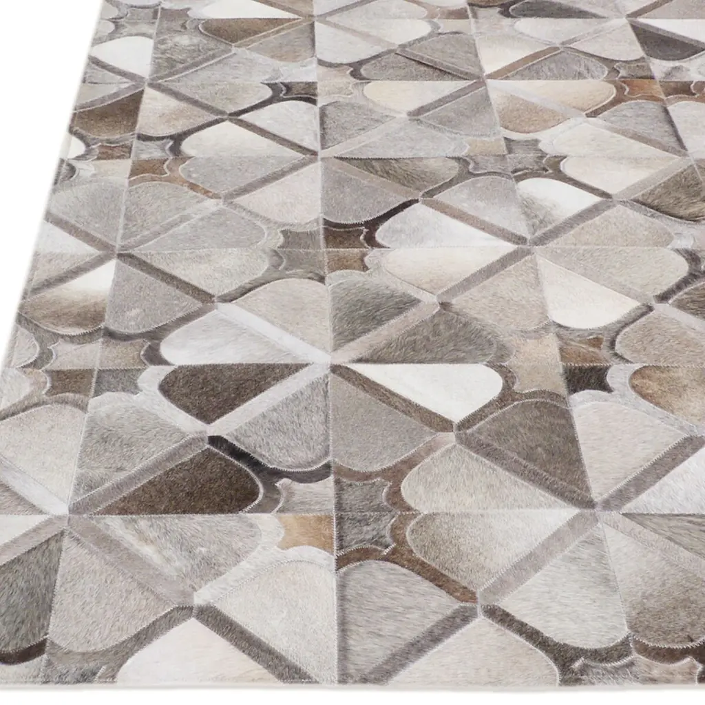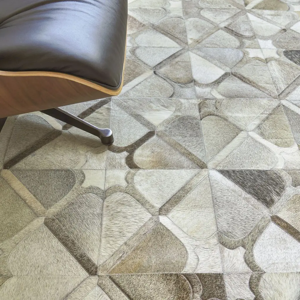Pieces of hair-on cowhide were stitched together to create this handcrafted rug's dazzling geometric motif. The variety of tones gives the rug a luxurious sense of depth and make it a work of art as well as a practical floor covering. A rug pad is recommended to help prevent slipping.