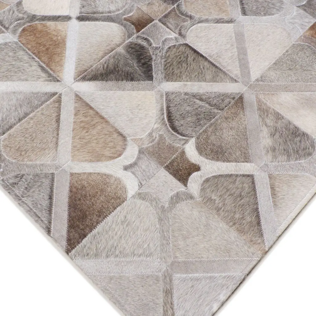 Pieces of hair-on cowhide were stitched together to create this handcrafted rug's dazzling geometric motif. The variety of tones gives the rug a luxurious sense of depth and make it a work of art as well as a practical floor covering. A rug pad is recommended to help prevent slipping.