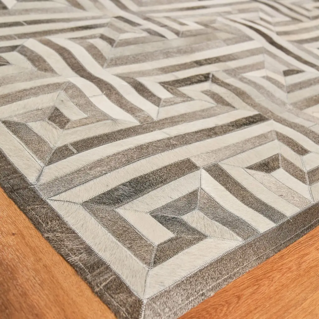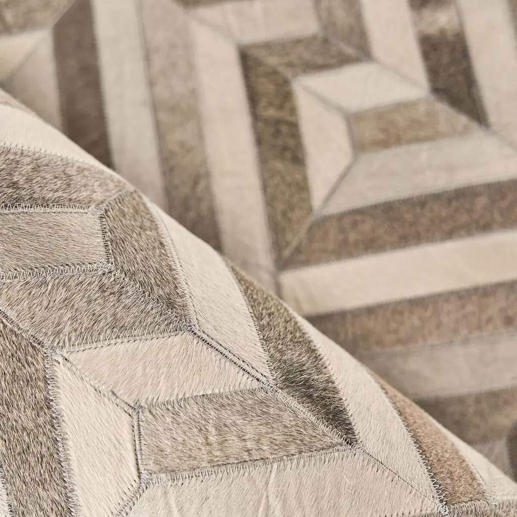 Pieces of hair-on cowhide were stitched together to create this handcrafted rug's dazzling meander motif. The variety of tones gives the rug a luxurious sense of depth and make it as much a work of art as it is a practical floor covering. A rug pad is recommended to help prevent slipping.