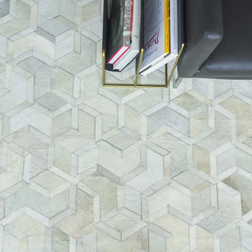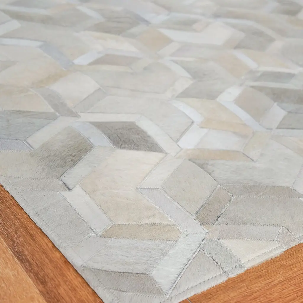 Pieces of hair-on cowhide were stitched together to create this handcrafted rug's dazzling geometric motif. The variety of tones gives the rug a luxurious sense of depth and make it as much a work of art as it is a practical floor covering. A rug pad is recommended to help prevent slipping.