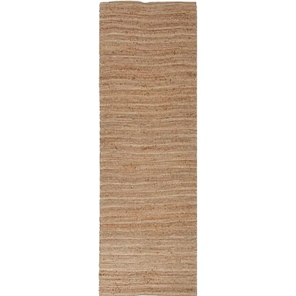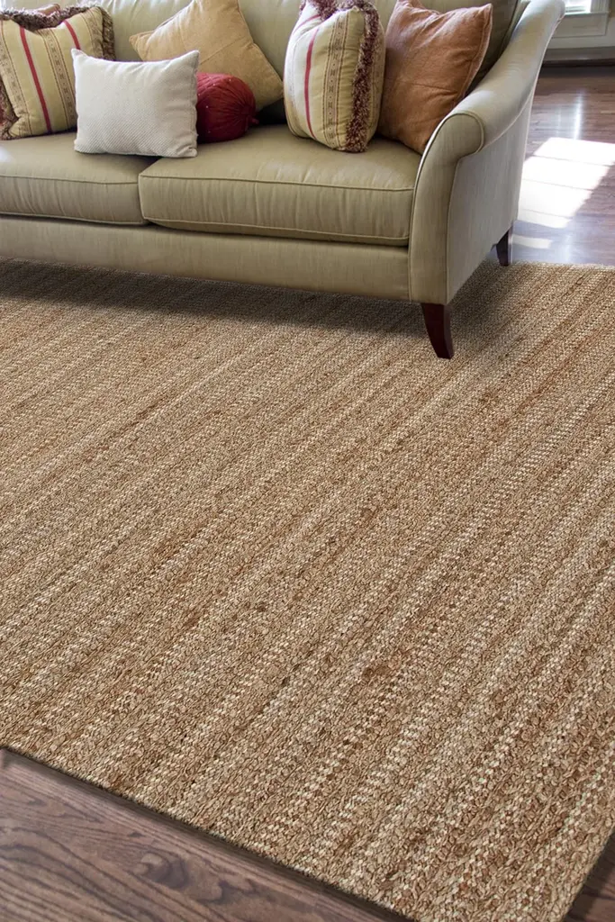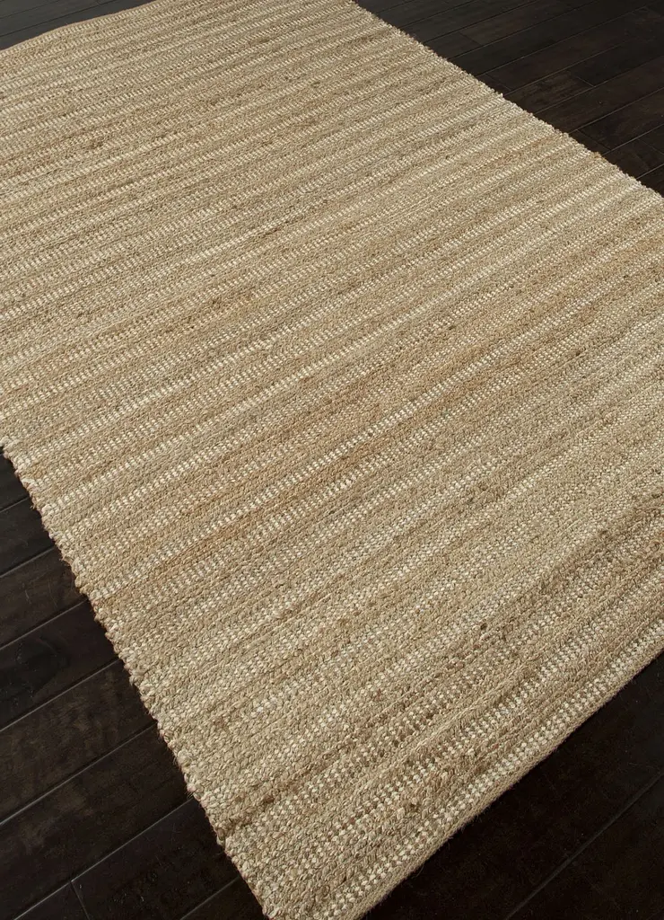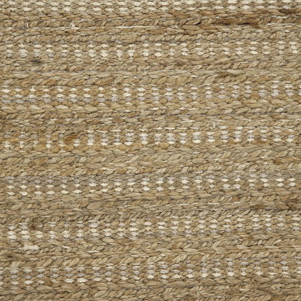 This Indian area rug combines natural jute and rayon in an interplay of textures that is underscored by the harmonious combination of taupe and ivory. The result is a hand-loomed rectangular rug designed to lend a warm, earthy accent to a favorite space.