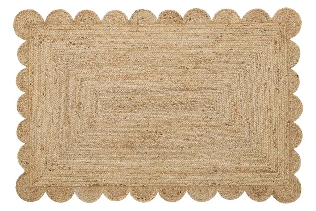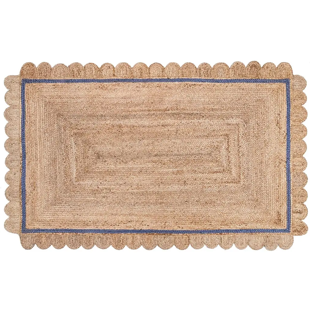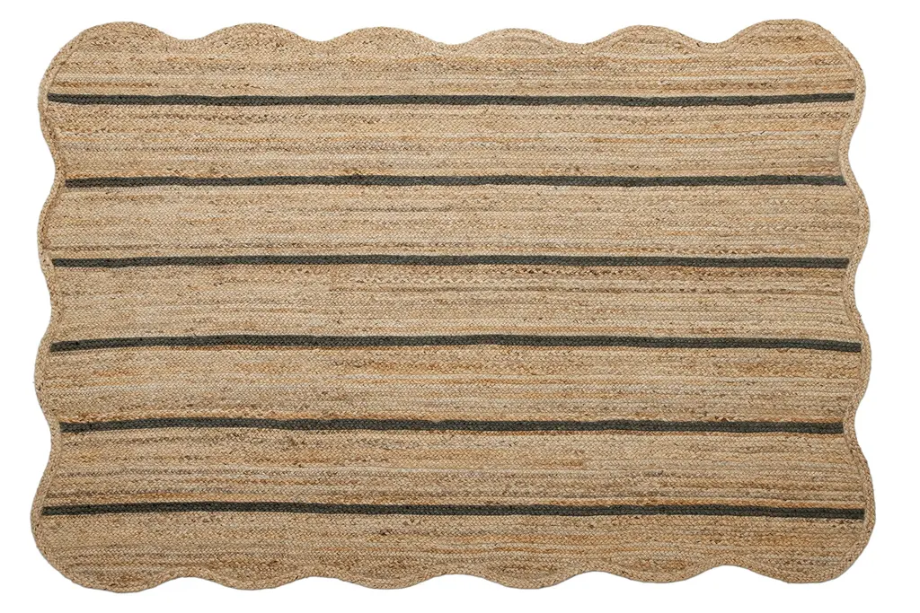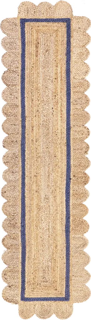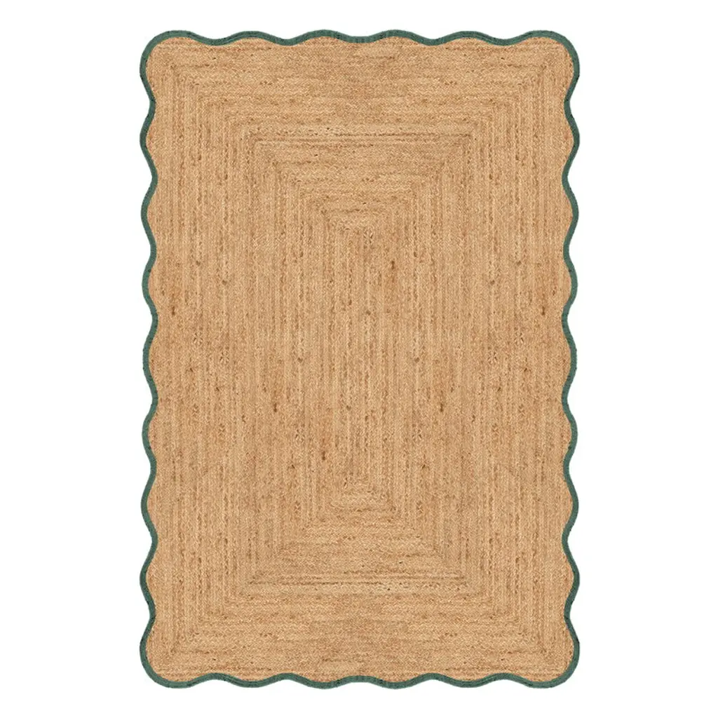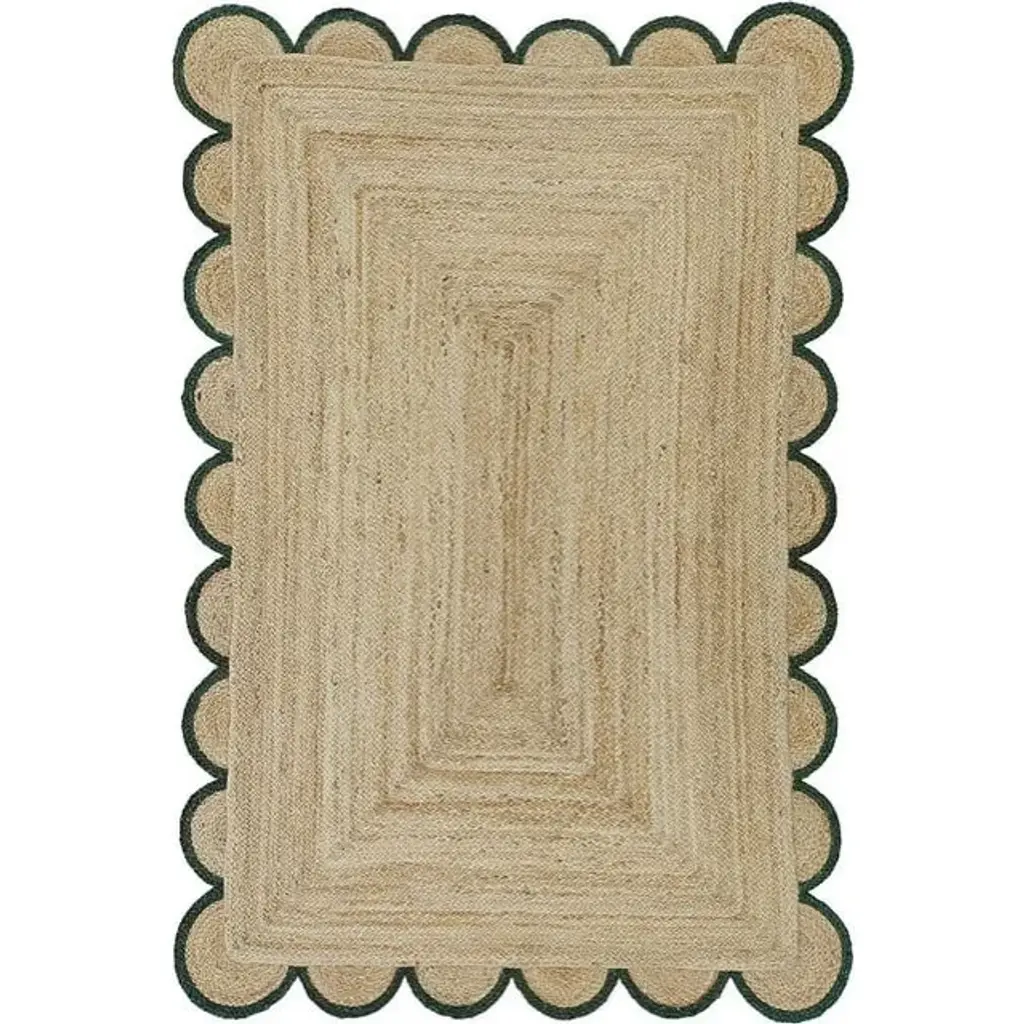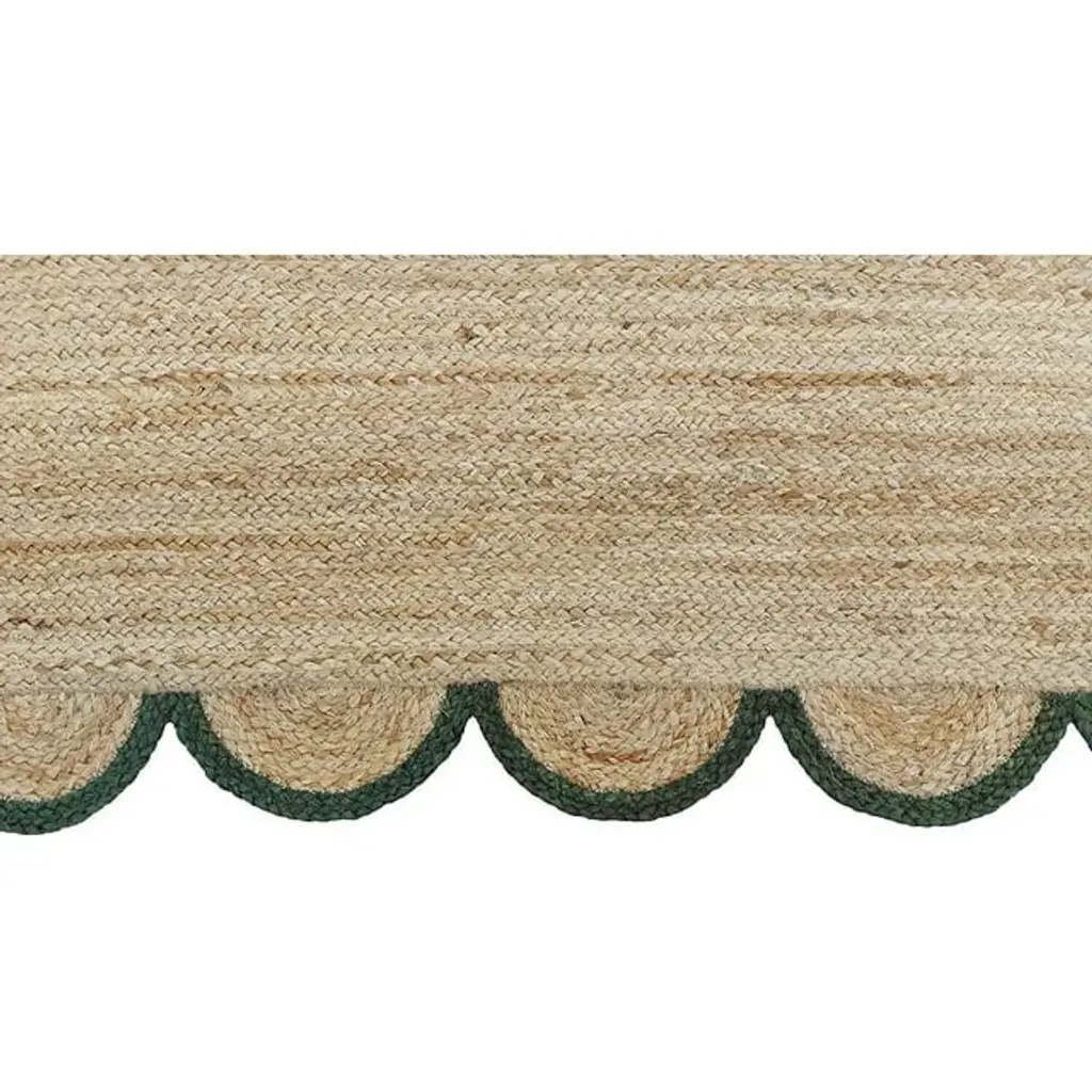Natural Jute Area Rug With Green Scalloped Edges, Unique Farmhouse Style, Green, 4' X 10'