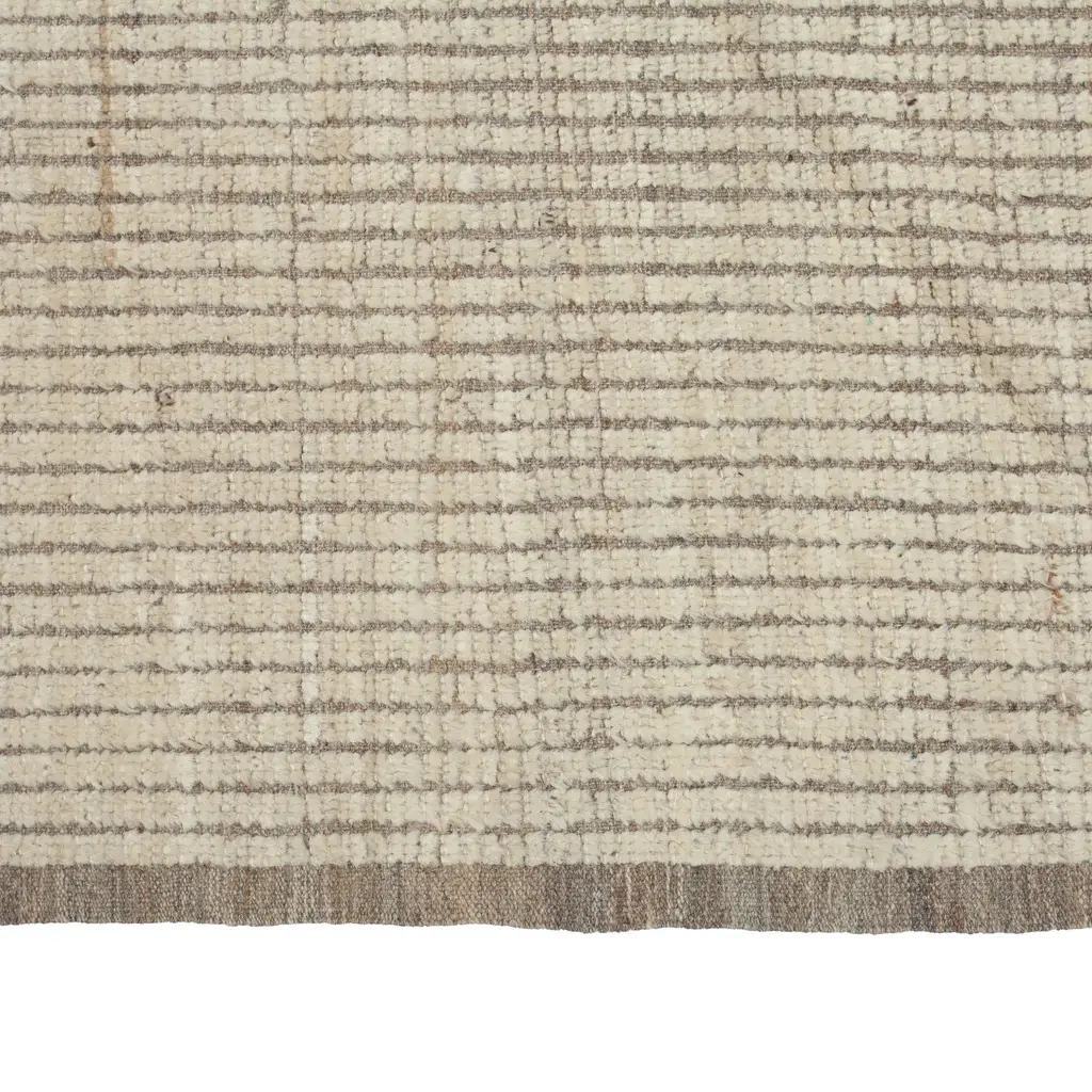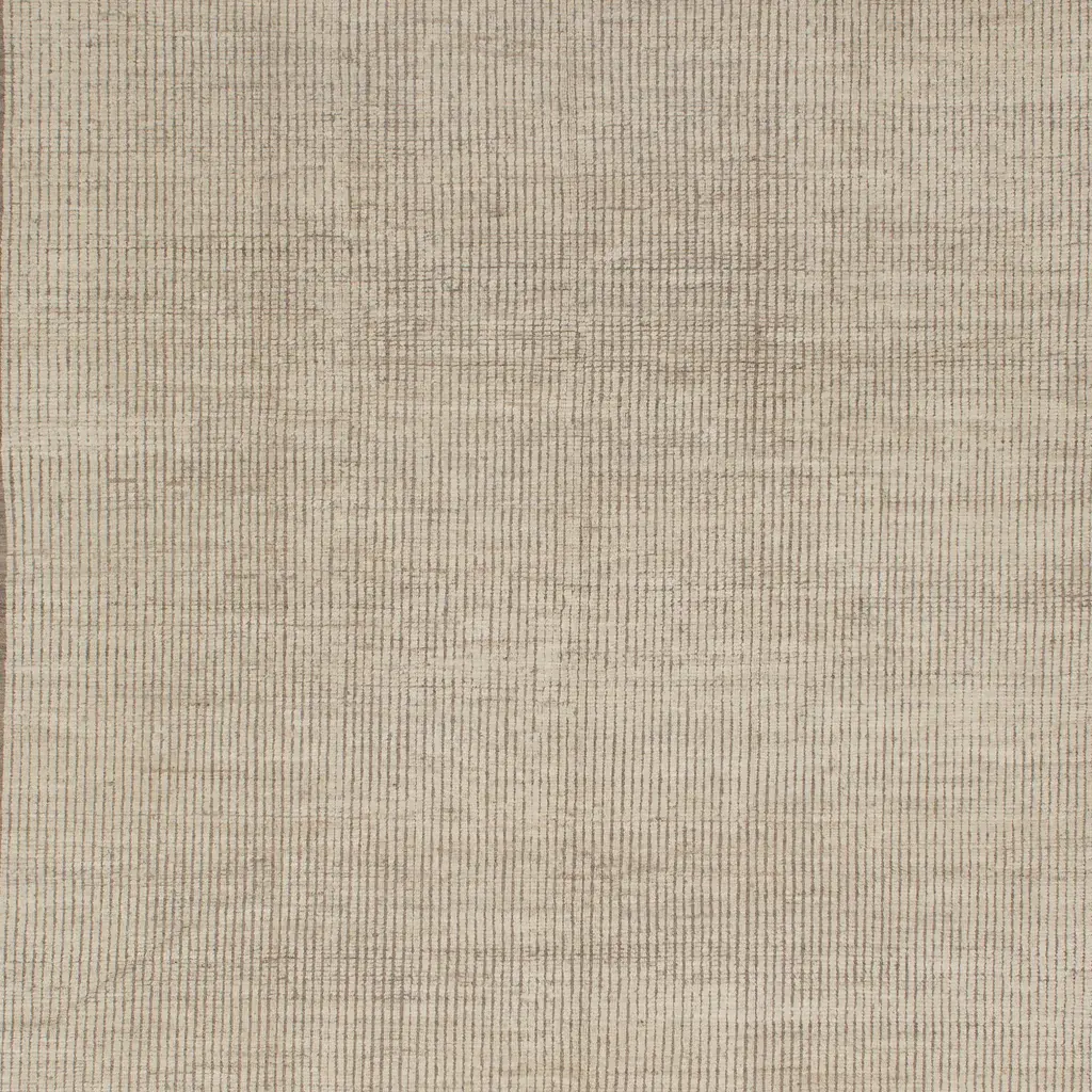 Inspired by the grounding foundations of Earth's natural colors and pure materials, this Natural Zameen Transitional Wool Rug - 9'4" x 12' features a shifting solid design in varying shades of cream with a darker backdrop that is reminiscent of a sandy desert while paying homage to traditional rug designs of history's past. The neutral color palette in this textured wool rug is made from a unique blend of recycled wool that comes from the sheering of other plush wool rugs and hand-spinning the remnants into a one-of-a-kind combination of colors. Hand-knotted in Central Asia by small collectives of rug artisans who are given artistic freedom to create unique motifs, this one-of-a-kind rug will be celebrated for centuries with its compelling textured design elements, sturdy construction, and impactful presence in any living room, dining room, or bedroom.