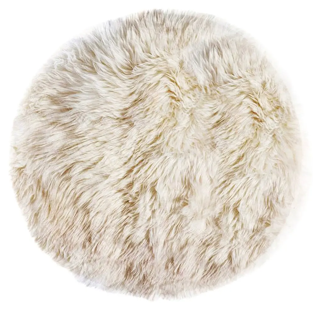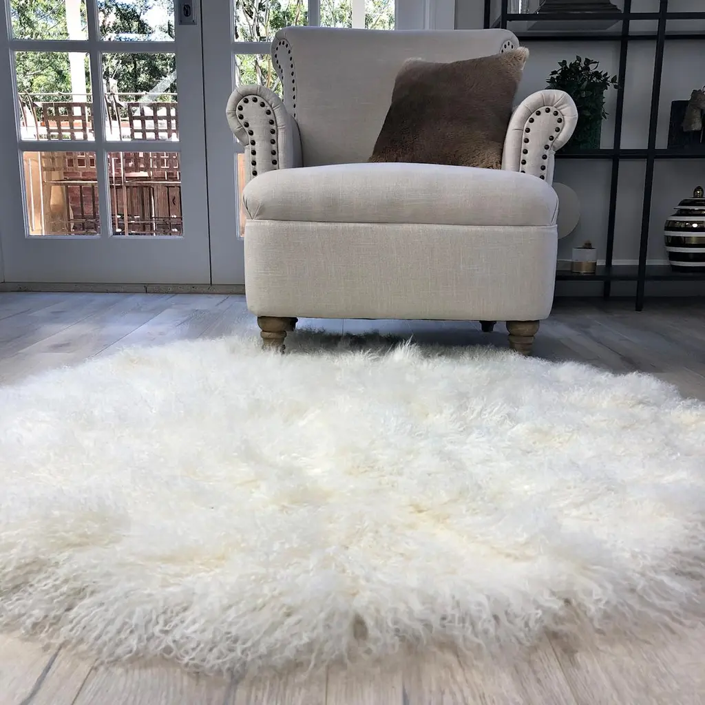 Style your interior floors with the beauty of a natural fur rug that looks and feels luxurious whilst adding the natural charm, elegance and character that genuine fur / wool has to offer. Meticulously handcrafted from genuine Mongolian Sheepskins, this natural white fur rug has a fine woollen fibre with a silky feel and fluffy appearance formed by its distinctive curl and crimped like texture. Its long and fluffy fur like wool falls effortlessly on the floor while its elegance and supreme softness makes Mongolian sheepskins rugs unique to other sheepskin rugs as they deceivingly look and feel like fur and will be loved by all. Whether your looking for a nursery rug or a sheepskin rug for the living room, this 4 foot round fur rug will boast the pinnacle of stylish design and luxury.After a long days work, take off your shoes and relax in the luxurious comfort and softness of this shaggy fur rug with its quilted cotton reverse backing designed for additional foot comfort. From country side living and luxury apartments to contemporary and Classic spaces, this Mongolian Sheepskin rug will look refined and stylish in any decor space.At eluxury we are makers of our sheepskin rugs therefore offer a custom make and bespoke service with our large color selection of Mongolian sheepskins available in over twenty colors with a custom dye service available for larger rug sizes.Features:Dimensions: 120cmOverall dimensions: 130cm roundMade from genuine Mongolian sheepskinsColor: natural white (milk)wool length: up to 4" (10cm)pile height approx. 1" (2-3cm)Lined with a quilted cotton backingMade In AustraliaProduct care:Mongolian sheepskin is naturally a very light weight sheepskin therefore a non slip grip is highly recommended for this product.Vacuum on low setting and without brush. Shake outside often. This will refluff the woollen fibresSpot clean only with clean lukewarm water and gentle wool wash. Do not submerge into water or wash. Do not apply chemical agents to the wool. Do not brush. Dry clean only. Do not steam Clean. Non slip grip highly recommendedKeep away from direct sunlight.Color swatchSheepskin color swatches are available upon request. A delivery fee may apply.-Pantone color dye service available for larger size orders.