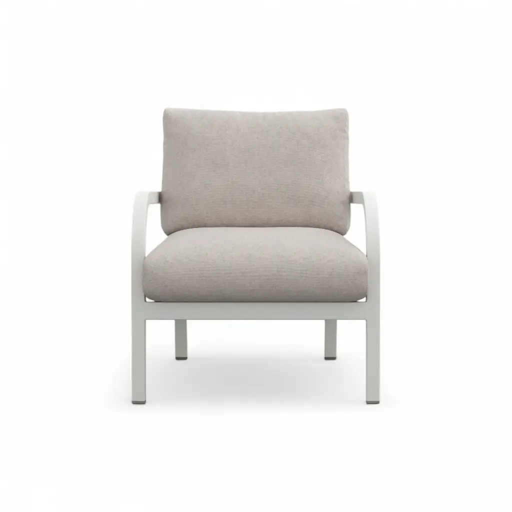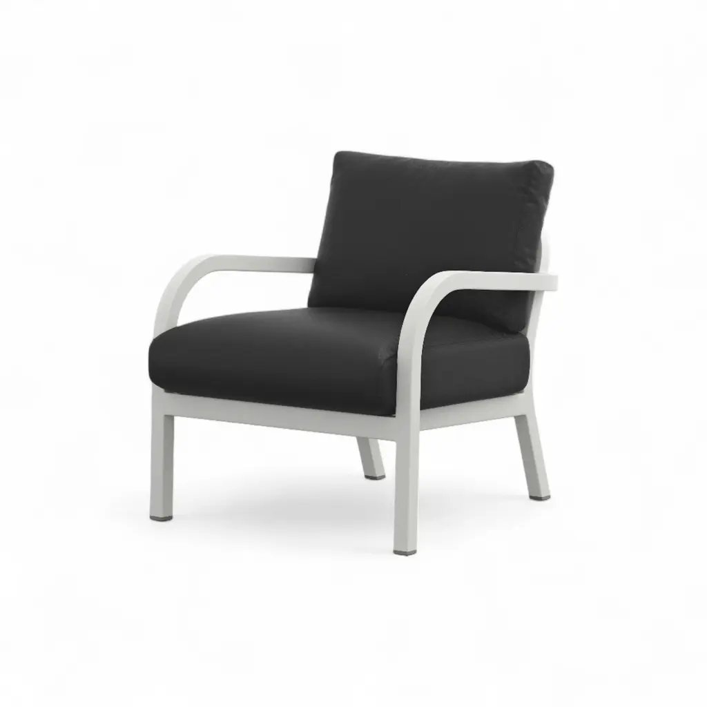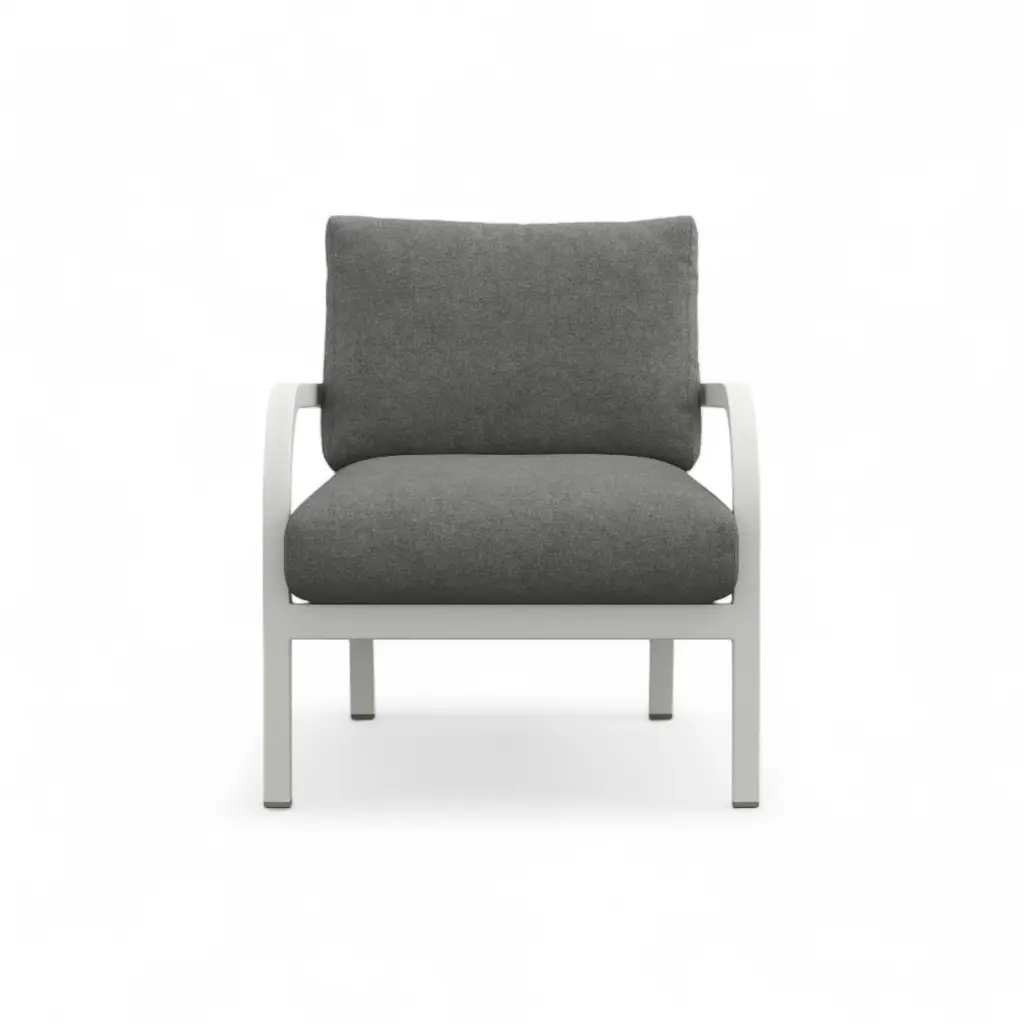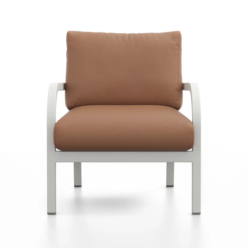 Does the white-grey coating chip easily? No—the baked-on powder coat bonds to the aluminum and shrugs off bumps, scratches, and UV fade. Handmade in Pennsylvania using Emeco’s 77-step process, the recycled-aluminum frame is welded, heat-treated, then finished in a soft neutral that works with any palette. Seat and back cushions come in leathers, wools, or outdoor textiles; swap them with an Allen key when seasons—or color moods—change. Marine-grade snaps keep pads in place on breezy balconies, and breathable inserts dry quickly after summer showers. Use one to lighten a study corner, group four around a low garden table, or move it indoors when guests spill over; the frame wipes clean with mild soap, the cushions zip off for laundering, and the chair’s lifetime guarantee covers life on either side of the threshold.