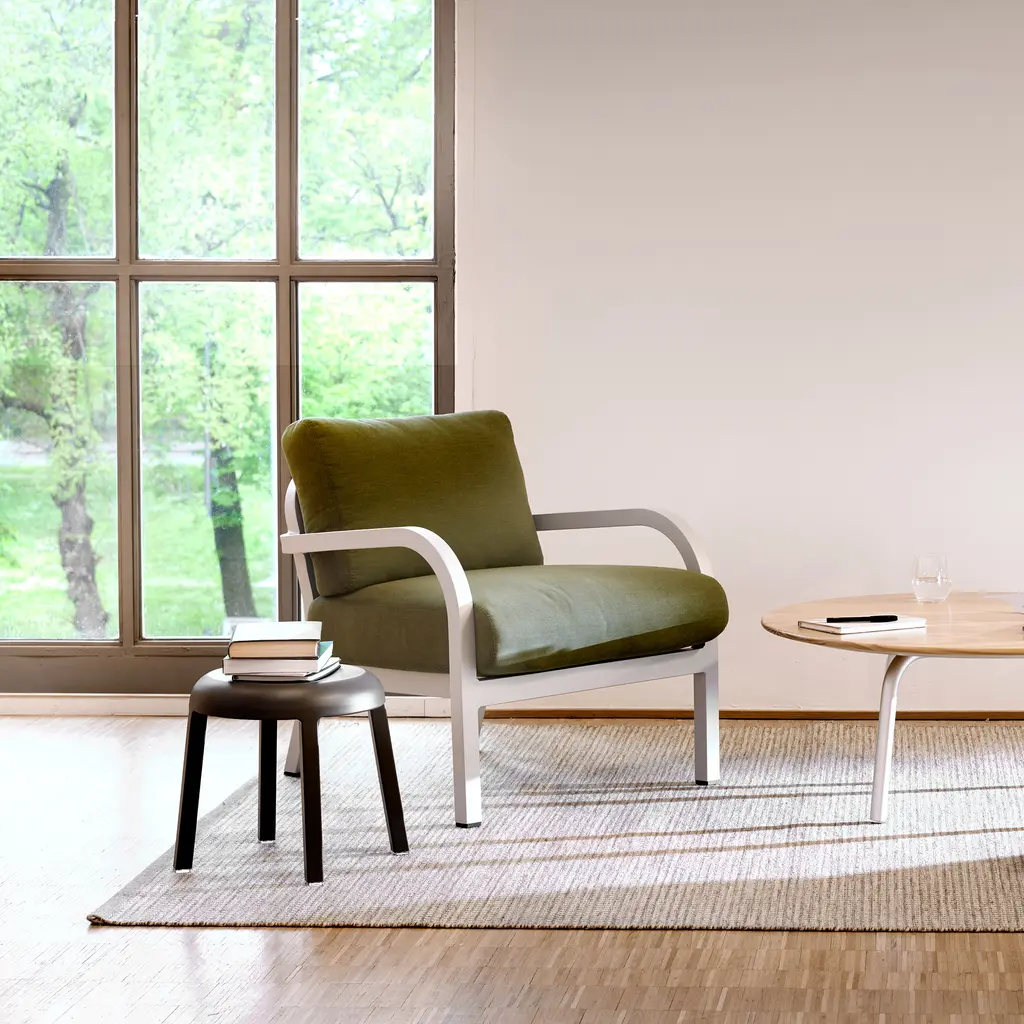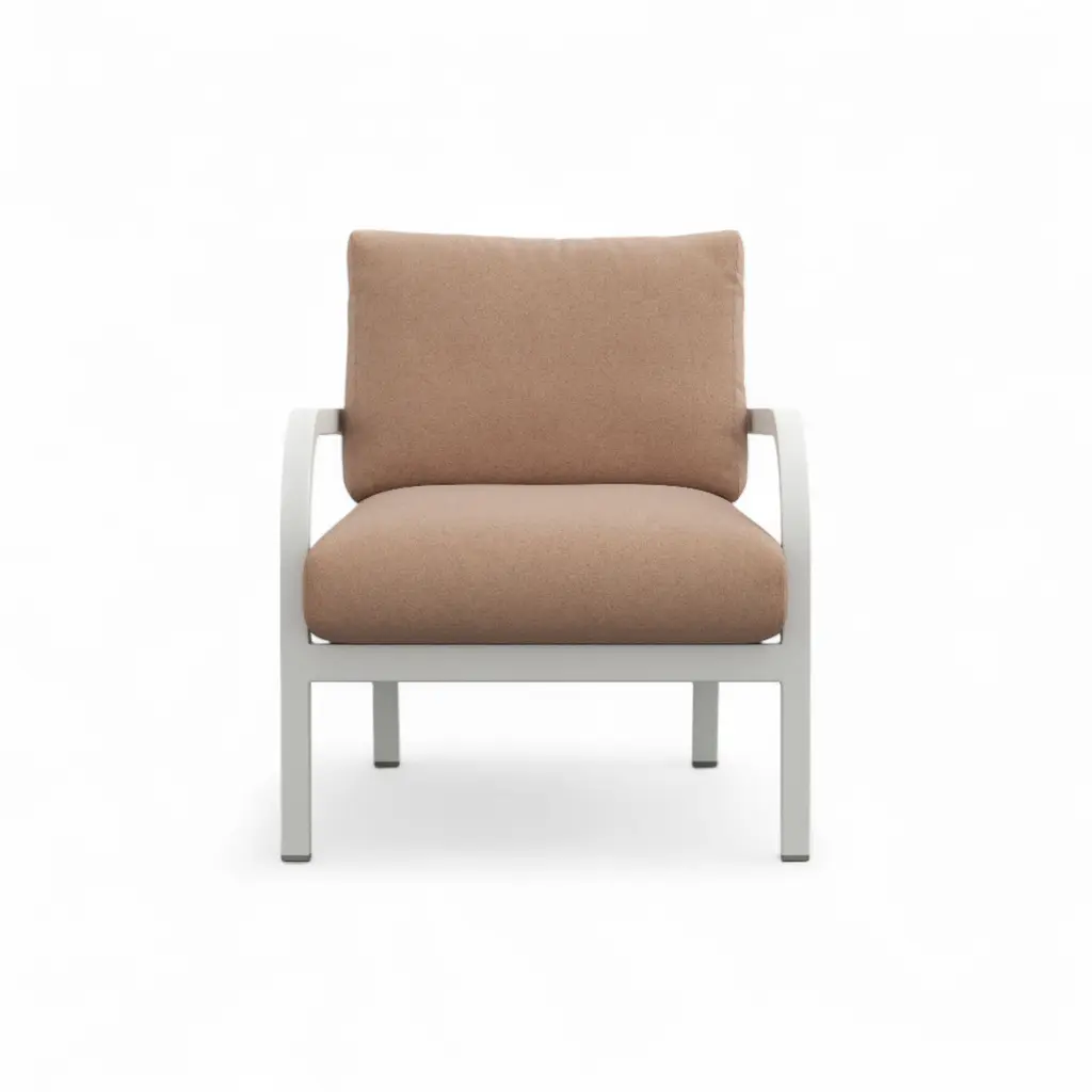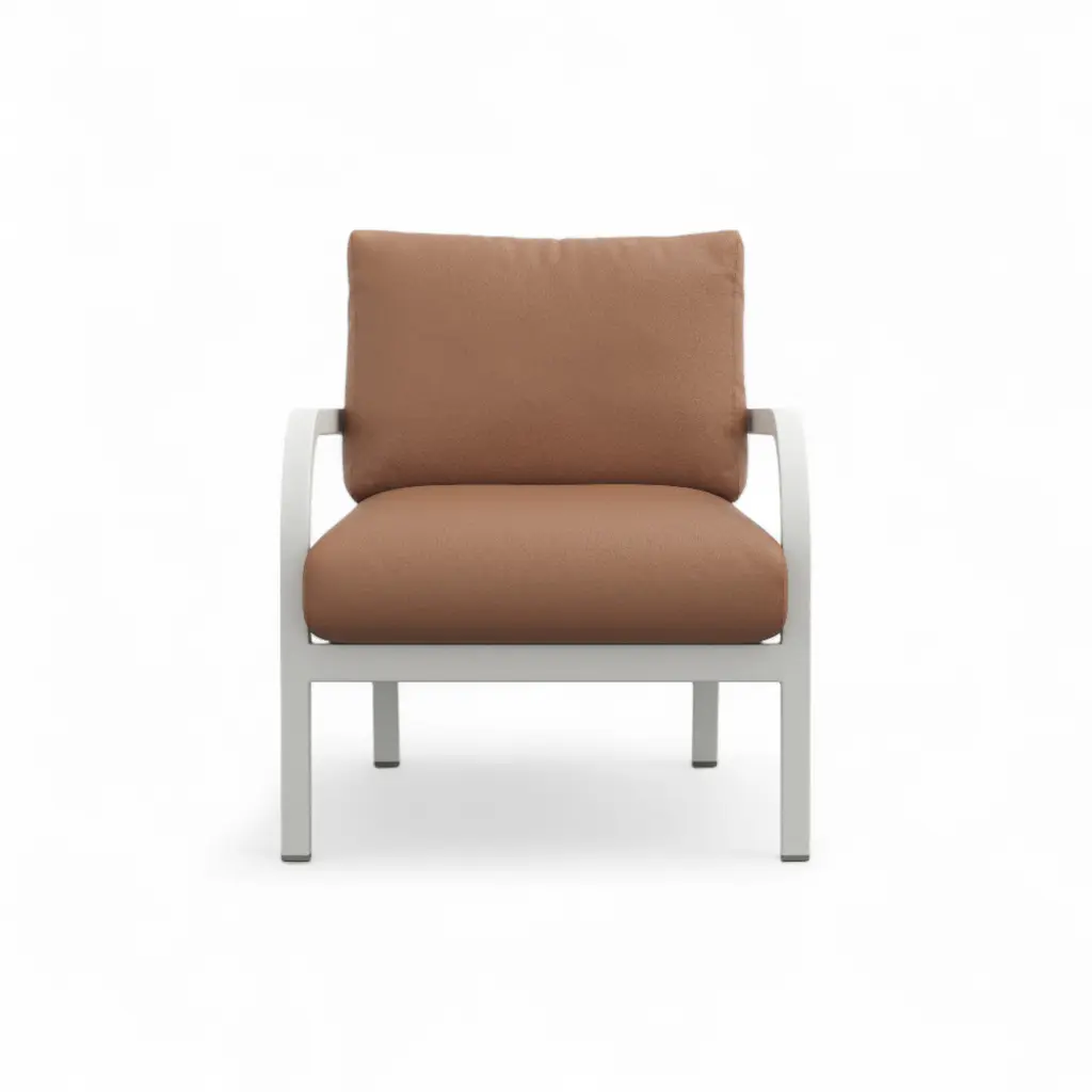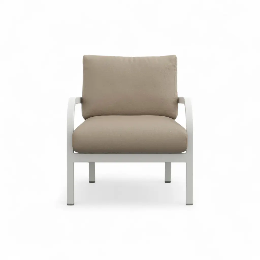 Does the white-grey coating chip easily? No—the baked-on powder coat bonds to the aluminum and shrugs off bumps, scratches, and UV fade. Handmade in Pennsylvania using Emeco’s 77-step process, the recycled-aluminum frame is welded, heat-treated, then finished in a soft neutral that works with any palette. Seat and back cushions come in leathers, wools, or outdoor textiles; swap them with an Allen key when seasons—or color moods—change. Marine-grade snaps keep pads in place on breezy balconies, and breathable inserts dry quickly after summer showers. Use one to lighten a study corner, group four around a low garden table, or move it indoors when guests spill over; the frame wipes clean with mild soap, the cushions zip off for laundering, and the chair’s lifetime guarantee covers life on either side of the threshold.