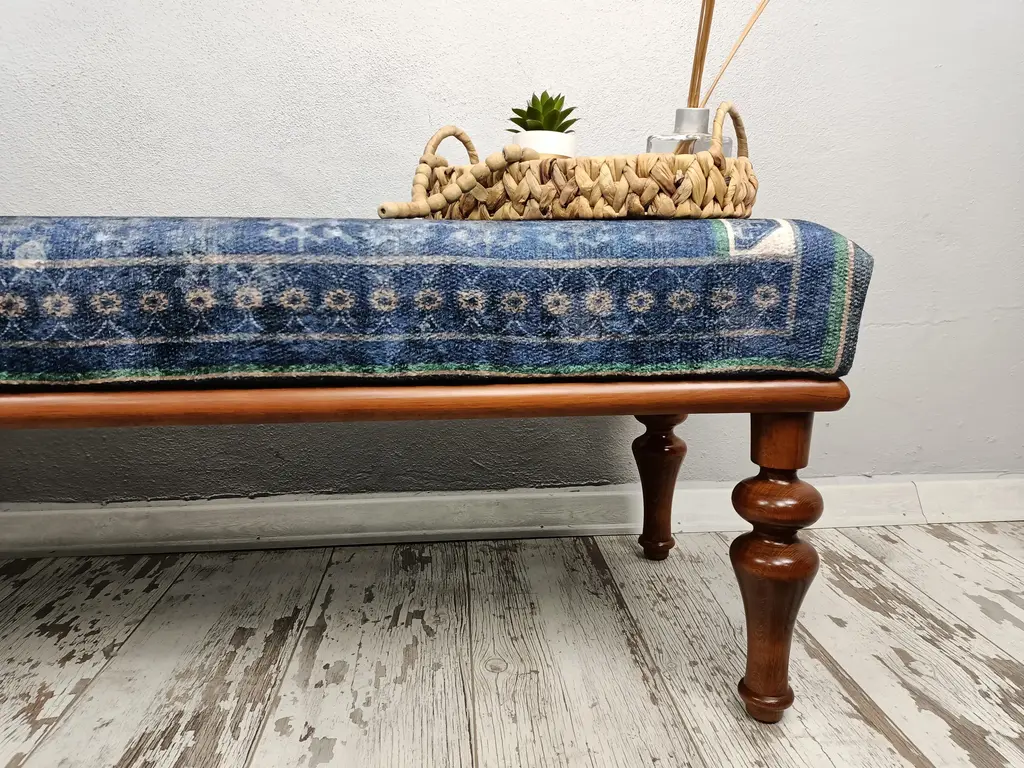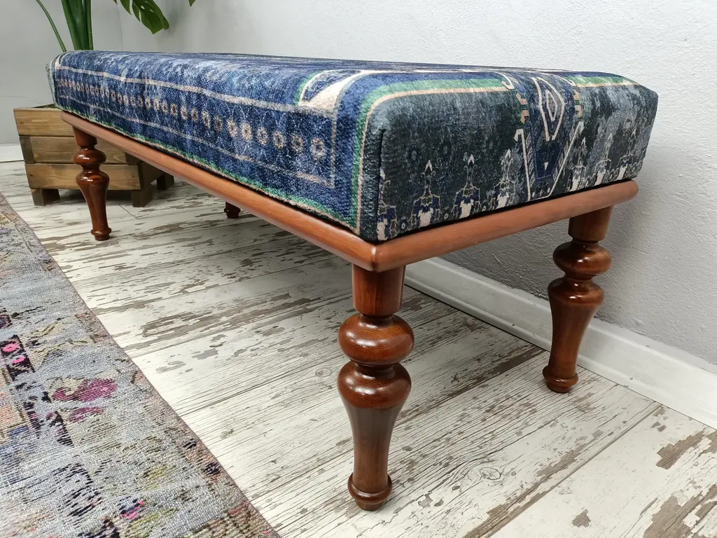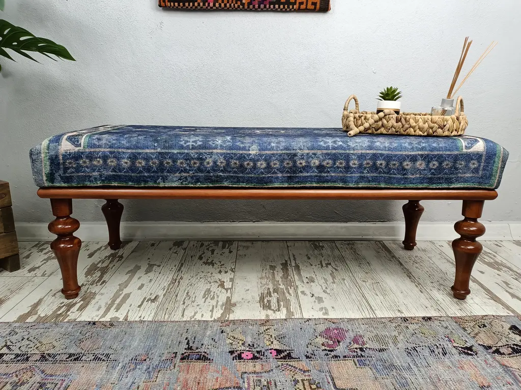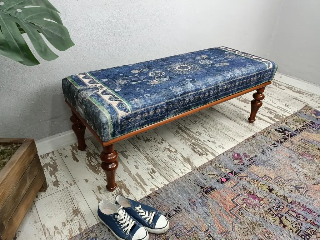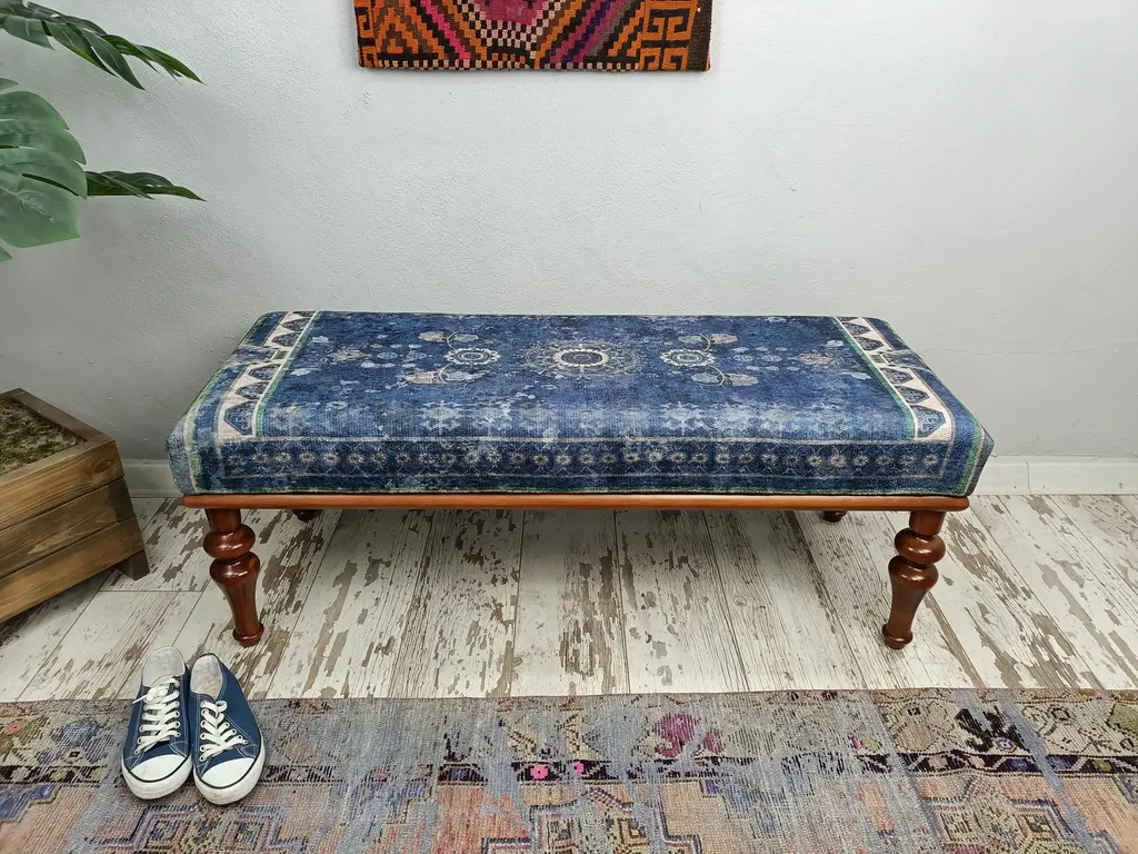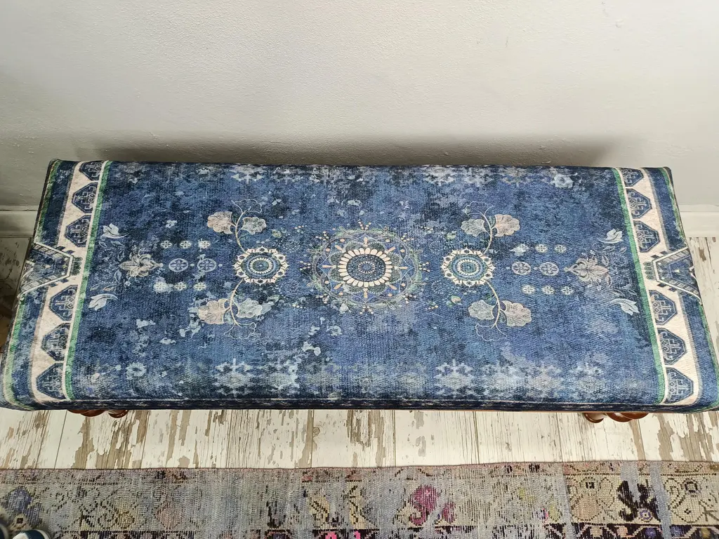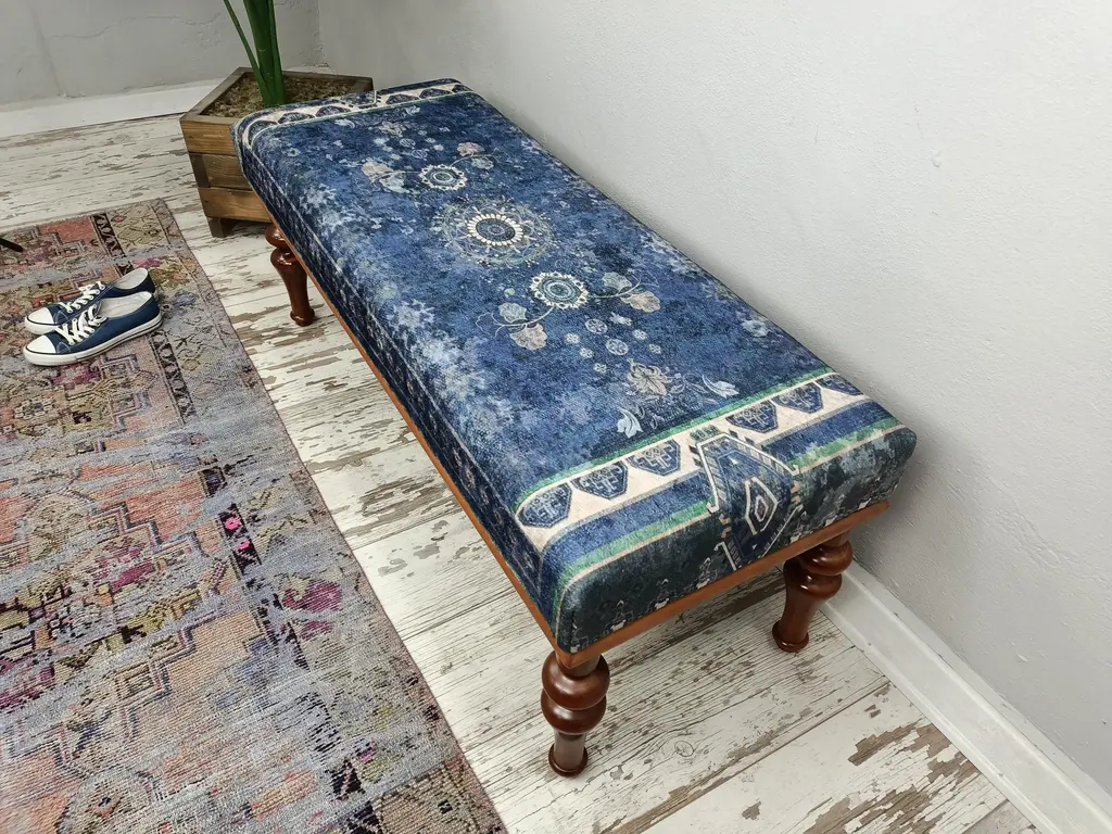 Navy Rug Print Fabric Upholstered Bedroom Bench