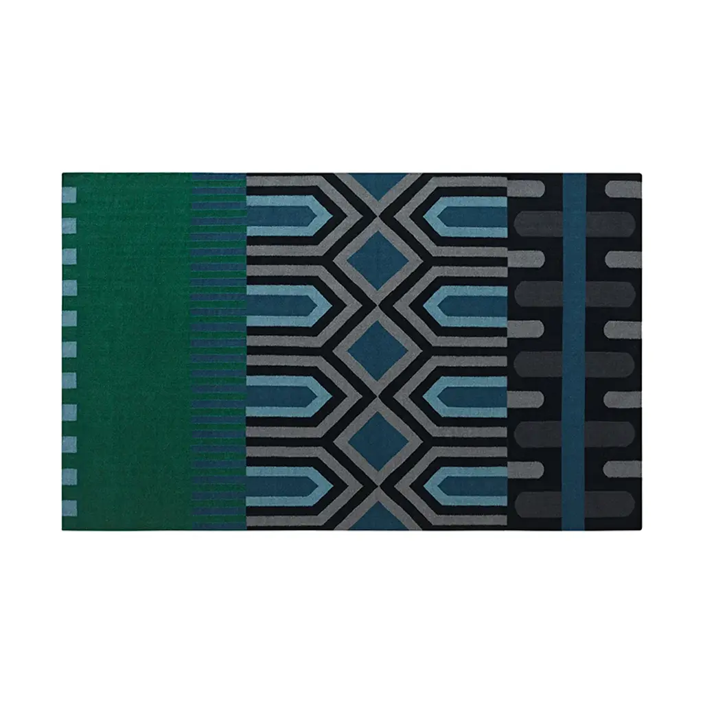 The Ndebele rugs are inspired by the culture of the African Ndebele people, known for their colorful facades. These are traditionally painted by women, who paint and decorate their houses with murals of geometric motifs and bright colors. The Ndebele kilims of ethnic style and contemporary language playfully combine intense tones and rotund designs with the geometry of their strokes. A graphic reading of ethnic roots reinterpreted into a more modern look. Features