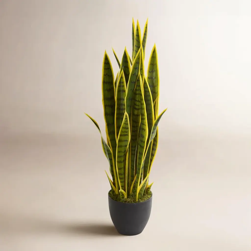 Featuring dark green leaves that extend in an upward direction with dark stripe accents, this 48-inch artificial sansevieria plant resembles the real thing. Tucked in a bright orange planter, it will easily blend with a mid-century-inspired home. For a southwestern-inspired look, arrange this ornament with weathered wood benches and earthy rugs.