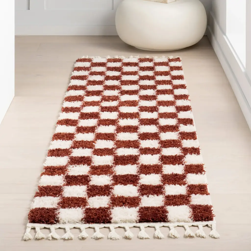 Nell Retro Checkerboard Tasseled Rug | Red - 2' 6" X 12'
