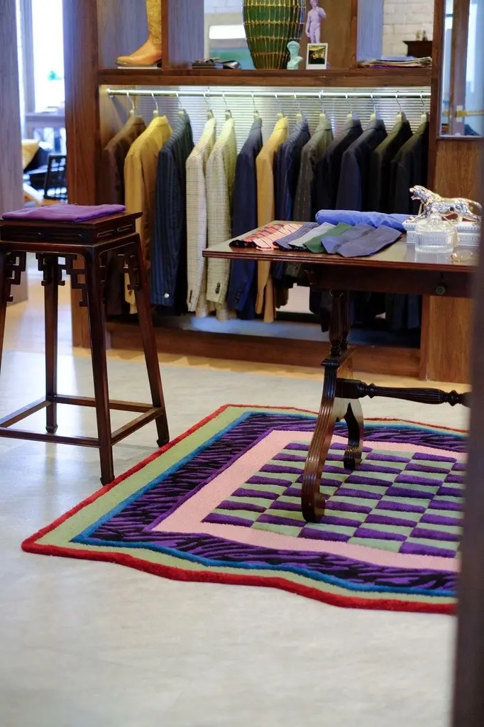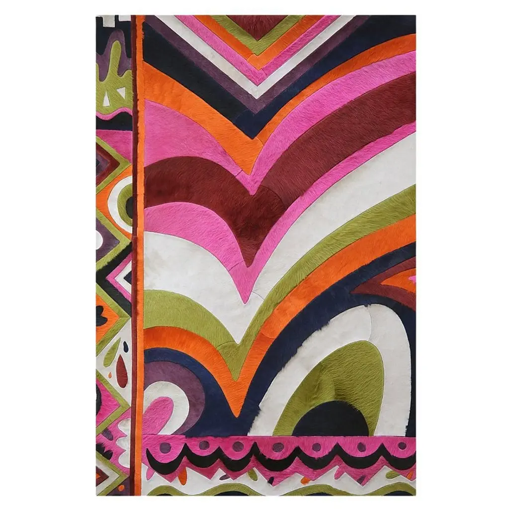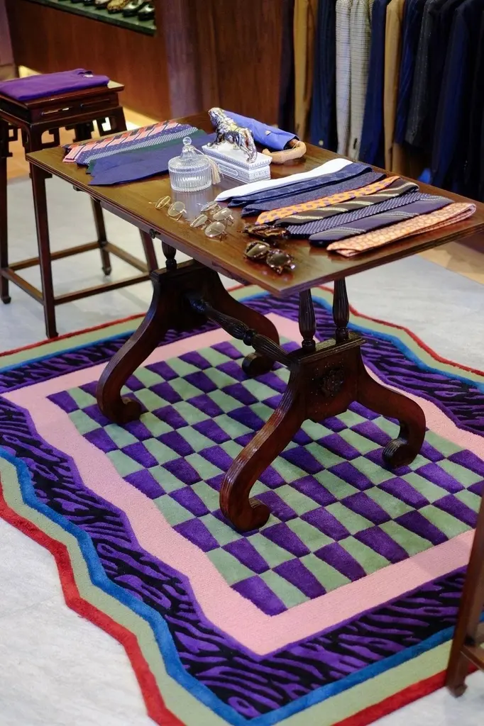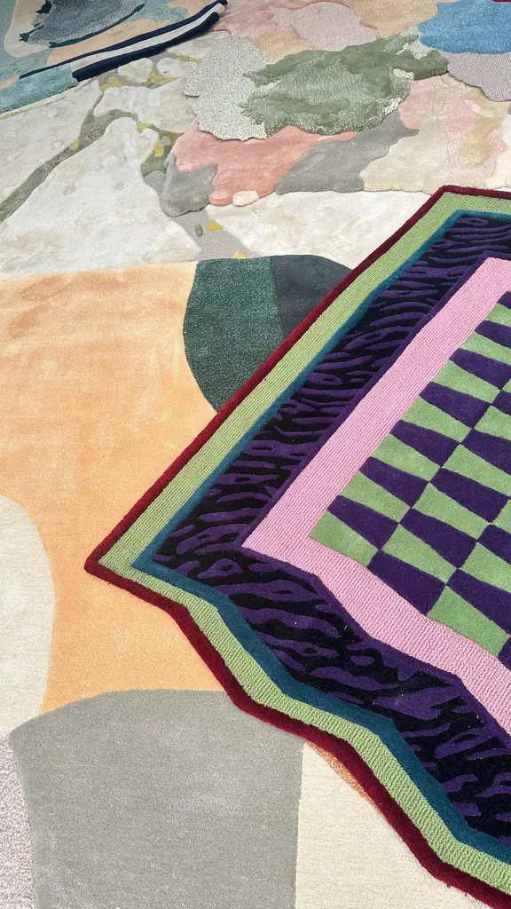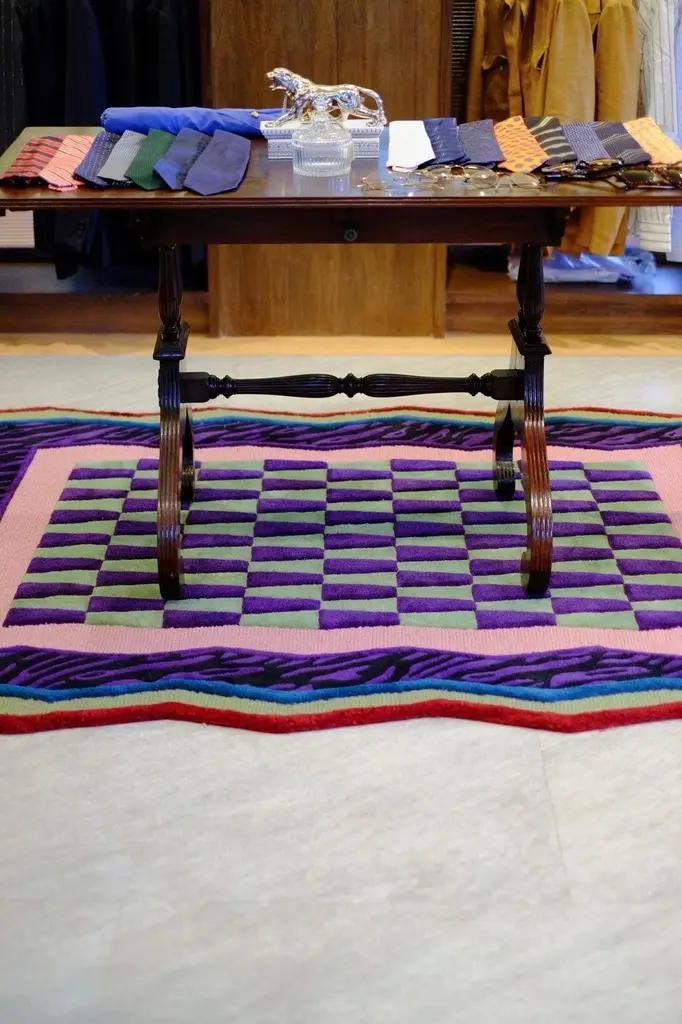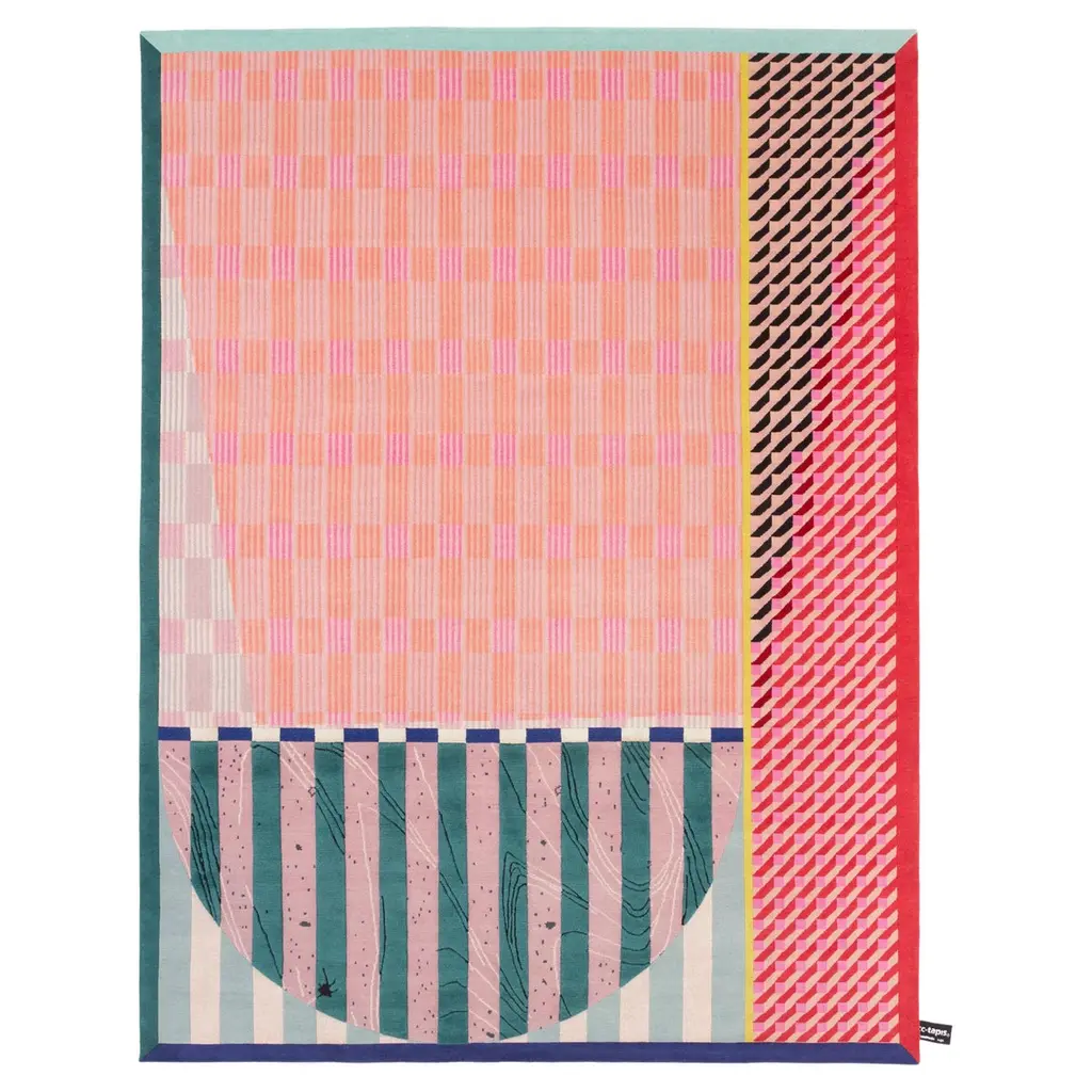 Neon Grid Mosaic rug is a bold fusion of 90s-inspired color accents and a dynamic mosaic pattern. The checkerboard design in lime green and deep purple creates a striking optical effect, while the jagged border in pink, green, and red adds an edgy, retro vibe. The black tiger-stripe detailing gives it an extra punch of attitude.