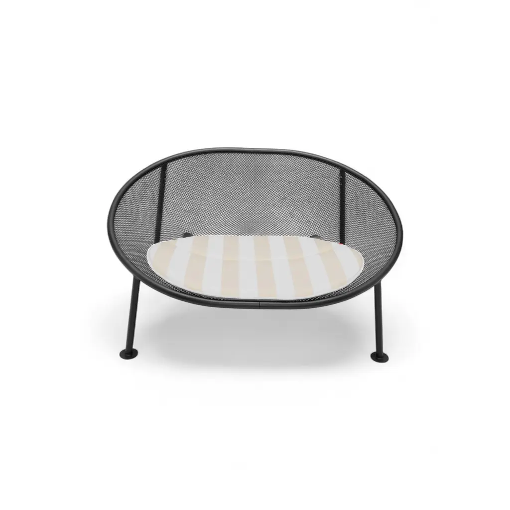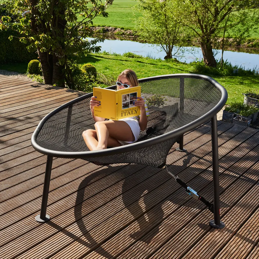 Netorious doesn’t decide for you—you choose the posture. Curl up alone with your knees tucked, sprawl out like a sun-lounger, or lean back shoulder-to-shoulder with a friend and pass the time. The oval frame is welded from aluminum, light enough to swivel it toward the sun yet rigid under 440 lbs of collective weight. A seamless knit net drops inside the rim, so airflow keeps you cool and the seat never pools rain. Tension cords run from net to legs; give them a tug to dial in the stretch. Need more give? Loosen. Prefer a taut perch? Cinch. The powder-coat shrugs off UV and salt air, and rubber foot pads plant the three legs on grass, deck planks, or stone without a wobble. Add the quilted pillow for full-body cushion or leave the mesh exposed for breezy afternoons. A tailored cover—spun from recycled PET—slips over when the forecast turns ugly, keeping pollen and showers off the seat so it’s ready the moment the sky clears.
