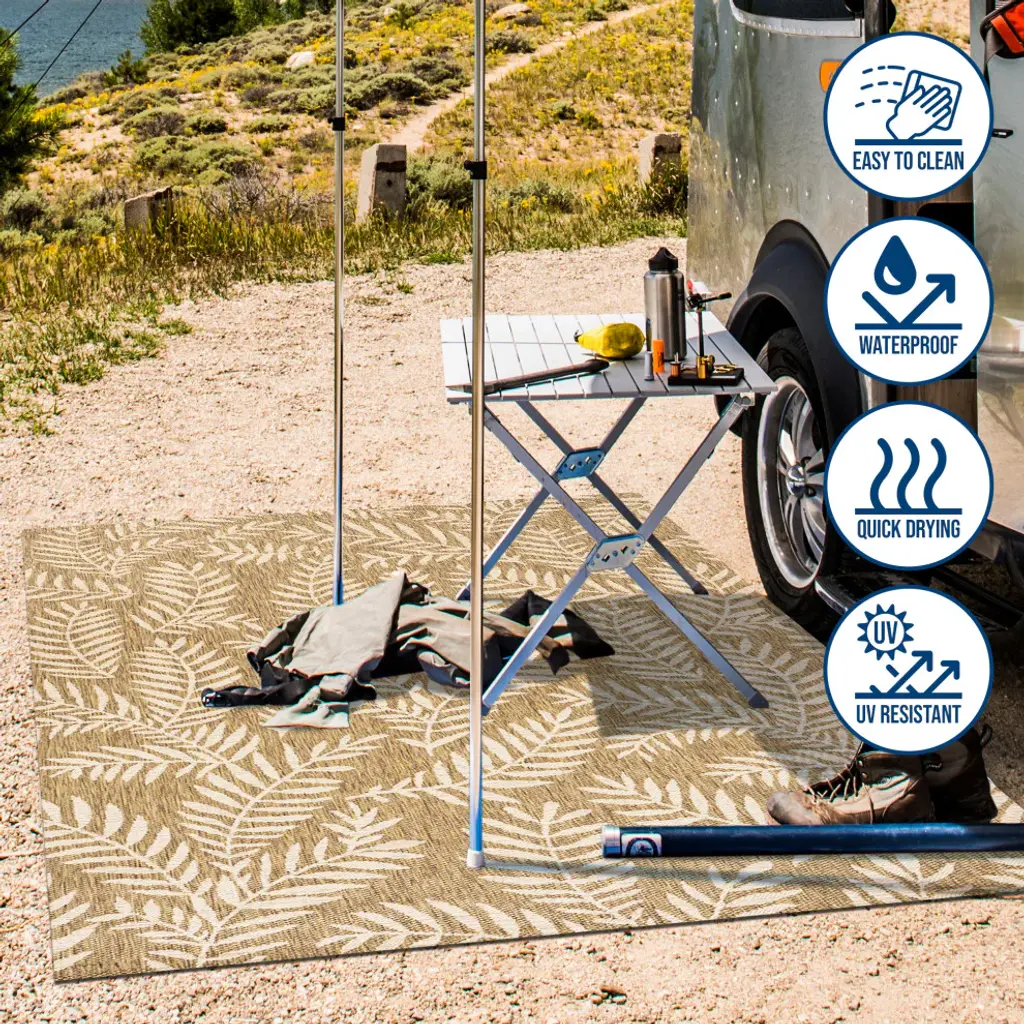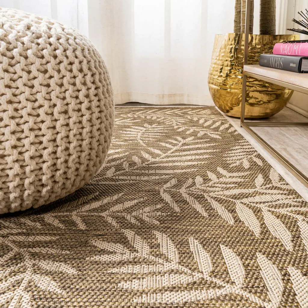 Whether you live in a tropical beach retreat or just love jungalow style, the allover palm frond pattern of this rug brings the jungle home. Scattered palm tree branches create graphic contrast in rich brown and cream tones. The busy pattern is perfect for your tropical patio, entry, kitchen, hallway, living room or bedroom. The pet-friendly and kid-proof flatweave design makes it easy to clean, and perfect for the beach house.Features:• Flat-weave construction of 100% polypropylene• Durable and easy-care - just sweep or hose down with mild soap and water• 100% Polypropylene• No backing, use of rug pad is recommended (sold separately)• Power Loomed in Turkey• Thickness measures: 0.19 in.• Available in multiple sizes and/or colorsRug Care:• Durable and easy-care - just sweep or hose down with mild soap and water• Packing and shipping may cause temporary creases in rugs, which will flatten out after a week on the floor; to expedite the process, try back-rolling your rug before laying it down, and then allow ample time for the remaining creases to relax• Please Note: Due to differences in monitors, some rug colors may vary slightly. Lengths and widths may vary from the published dimensions. Patterns may vary slightly according to shape and size selected.About us:Style your floors with JONATHAN Y. By combining fine craftsmanship and design, this New York creative studio is bringing fashion to your floors. The collection mixes sustainable organic materials, vibrant colors and trend worthy styles to create JONATHAN Y''s distinctive catalog of rugs.