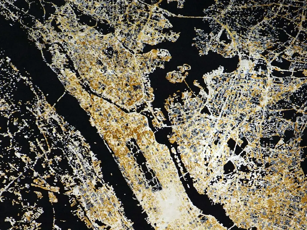 “Flying over New York” is a unique handmade example. This rug, hand-knotted with a high knot density, is available in New Zealand wool and Tencel in different pile heights cut with scissors to give it a three-dimensional design. The "Flying over New York" rug, designed in Italy, consists of approx. 155,000 knots/sqm for a size of 400 x 300 cm.The carpet depicting a night satellite view of New York and specifically its light pollution. Knot density: Persian knot, approx. 155.000 knots/m2Dimensions: W 300 x L 400 cm.Available only on request, also in 100% pure Silk.Leadtime: 4-5 months depending on the size.The customer can choose from a color range of over 5,000 different shades and all yarns are hand dyed to order, using only non-toxic and eco-friendly pigments.We have always loved experimenting and exploring the world of yarns: this has allowed us to offer a truly wide range of incredible materials with different properties, shines and softness.Our rugs are handmade using the same techniques as ancient Persian rugs in our manufacturing center in India, where rug culture has resided for centuries and where our expert craftsmen meticulously weave our creations. The history and culture that lie behind a handmade carpet are infinite and every carpet is the direct consequence of it.IMPORTANT INFORMATION REGARDING SHIPPING:Please contact us for an independent shipping quote as we provide high quality shipping at competitive prices due to our frequency of shipping, relations with international shipping companies and the possibility to organize directly from Italy.We take care of the entire customs procedure and paperwork. On request we organize a white glove delivery and installation of the artwork inside of the property of the client. All shipments are ALL-RISK insured.We carefully pack all artworks in strong wooden crates to ensure safe transport. This service is done directly in our atelier and is complimentary. All of our artworks travel with a shock watch system in order to monitorate rough handling by shippers and movers.
