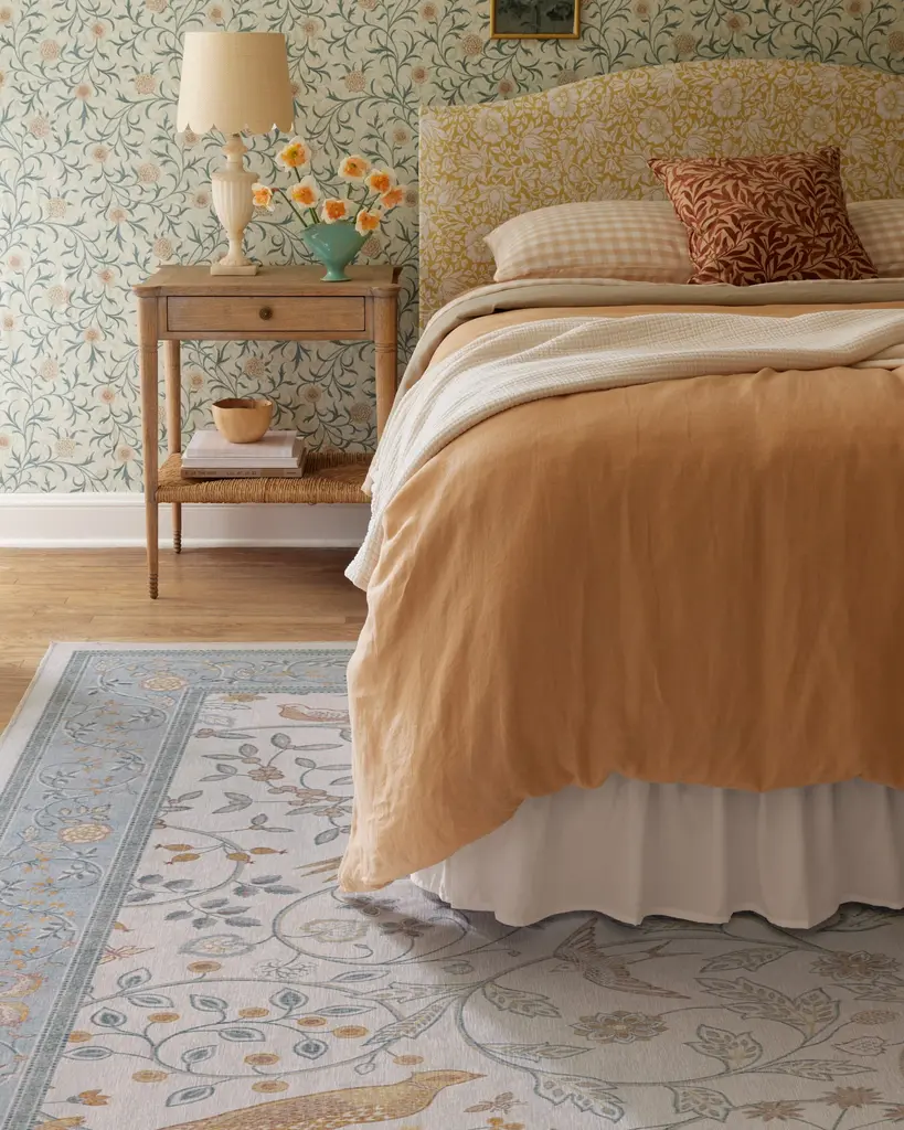 Play all day with our Morris & Co. Newill Ivory & Blue Rug. Inspired by the youthful embroidery work of Mary Newill, an associate of May Morris at the Birmingham School of Art, from 1905, this cozy composition brings heritage design to modern life. The cheerful, swirling display of birds, blooming florals, and meandering fauna is framed by a soft, detailed border. The powdery blue, bright ivory and warm gold in the composition add warmth to any room. Water-resistant, stain-resistant, and machine-washable. Rug colors may vary slightly according to your device and the lighting in your space.