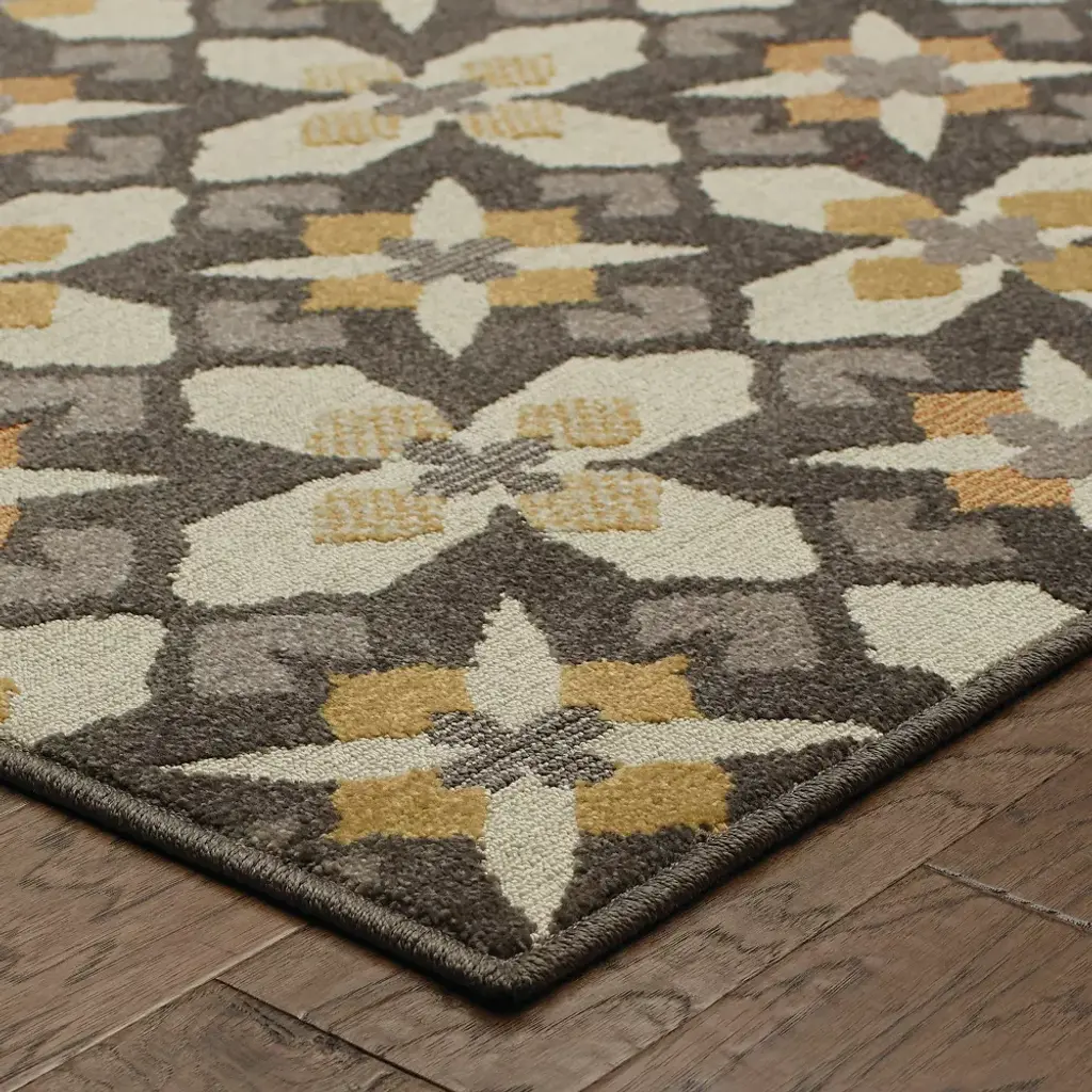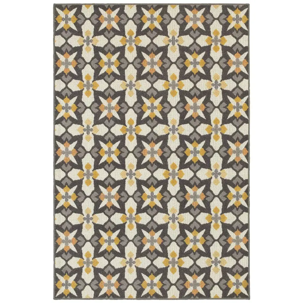 Full of interesting textures due to the cut loop construction, this area rug features a floral trellis pattern that is sure to compliment your patio or indoor decor. The soft gray and ivory colors are on point with today's contemporary to casual furniture, while the understated pops of yellow really bring this rug to life. Imported from Egypt. To maintain the life of your area rug, a rug pad is recommended. This rug can be cleaned using a mild soap and water mixture and then simply hosed clean and left to dry in a warm well ventilated area.