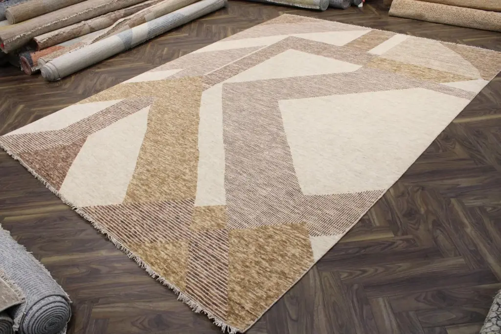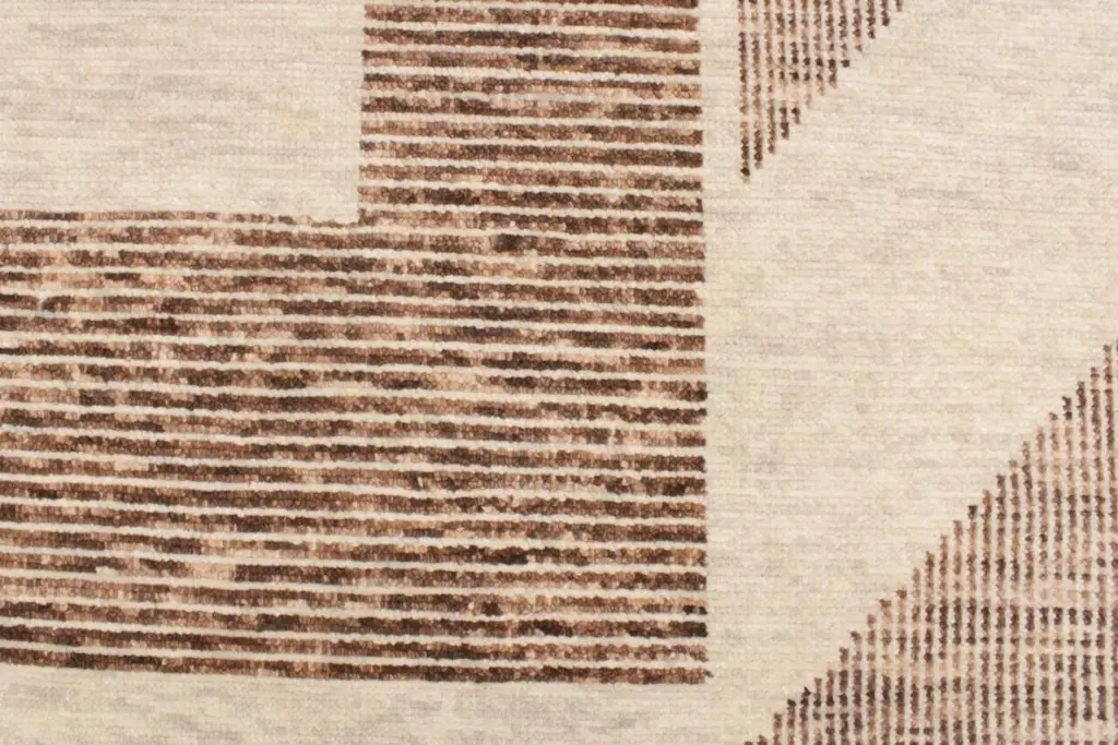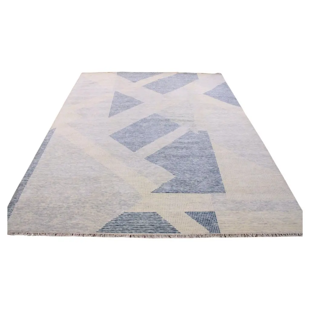 Pretty new modern design rug with nice geometrical Art Deco style design and beautiful colors, entirely hand knotted with wool velvet on cotton foundation.