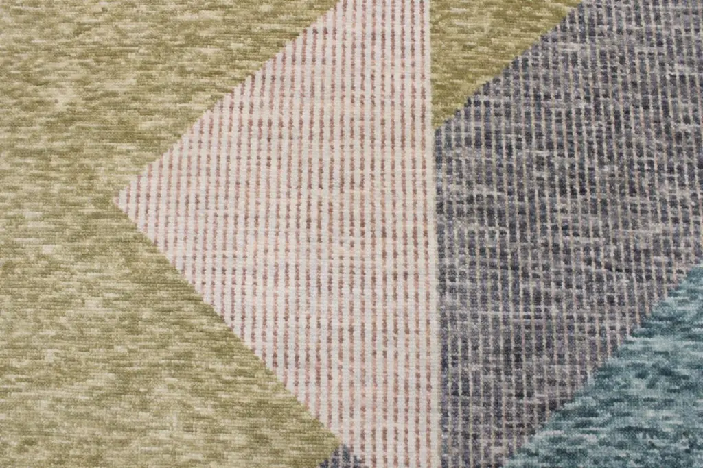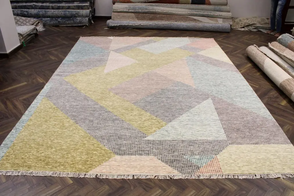 Pretty new modern design rug with nice geometrical art deco style design and beautiful colors, entirely hand knotted with wool velvet on cotton foundation