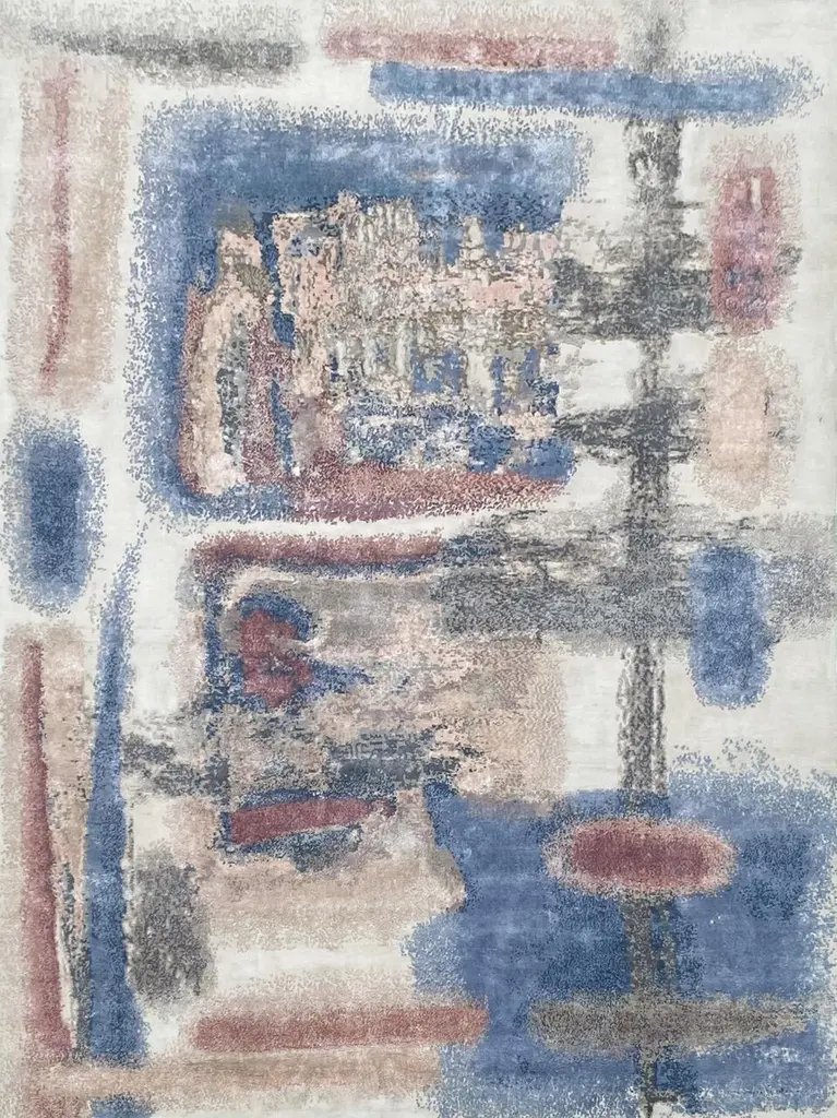 Very beautiful contemporary rug with a beautiful design and light colors, entirely hand knotted with Tibetan knots with wool and silk velvet on cotton foundation.