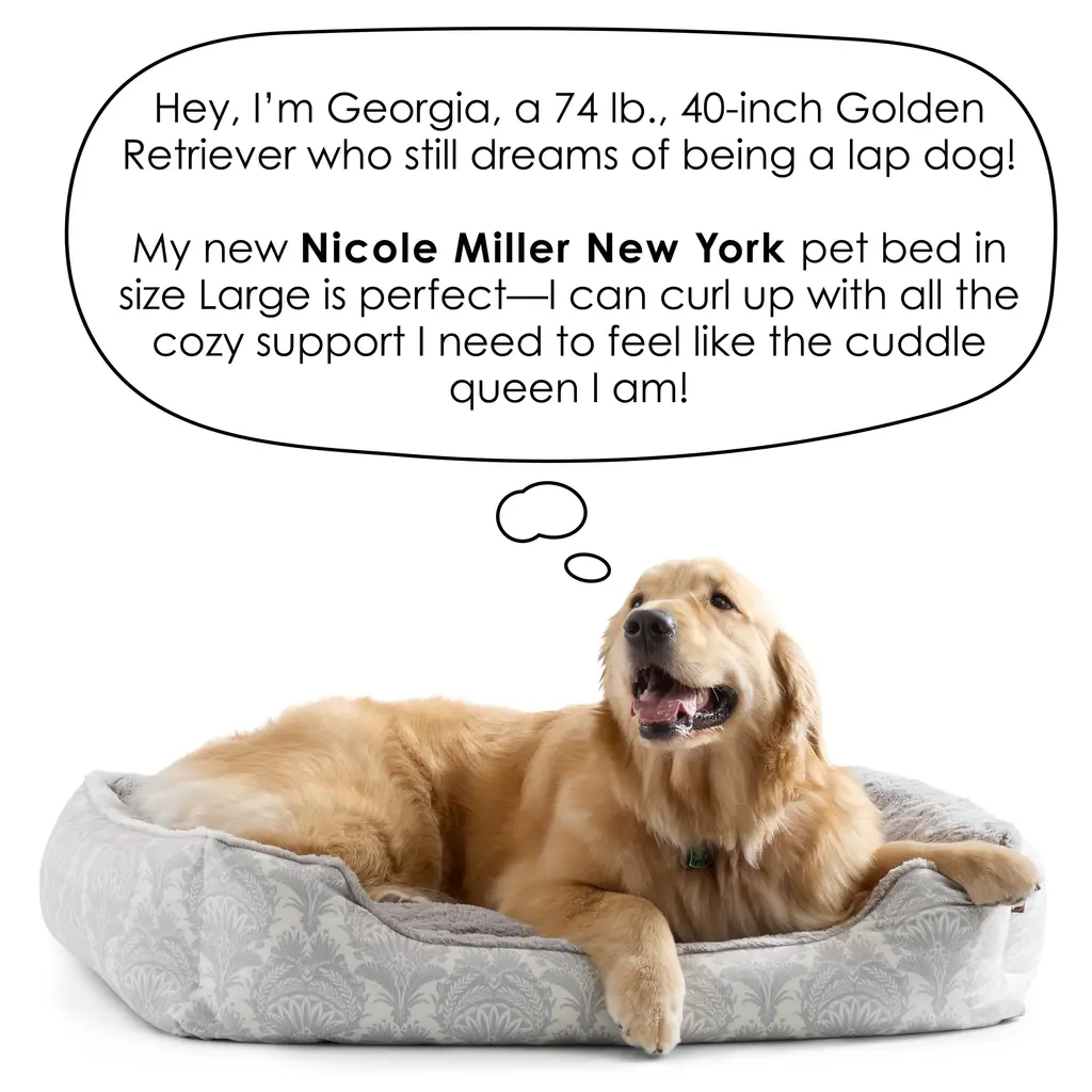 Pamper your pet with the Nicole Miller New York Pet Mod Damask Plushy Bolster Bed, designed for ultimate comfort and relaxation. Featuring a velvety soft, calming exterior and a cozy faux fur lining, this bed provides a soothing retreat for your furry friend. The removable, machine-washable cover on the Mod Damask Bolster bed ensures easy maintenance, while the water-repellent surface and skid-resistant bottom offer lasting durability and stability. Perfect for pets of all sizes, this stylish and functional bed is a must-have for any pet lover. Coordinate this pet bed with Nicole Miller New York area rugs for a cohesive, chic look. Standard 100 by Oeko-Tex Certified.