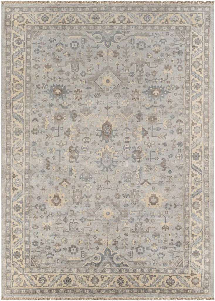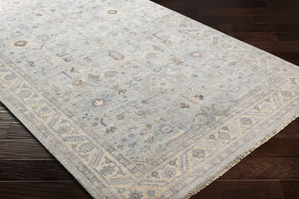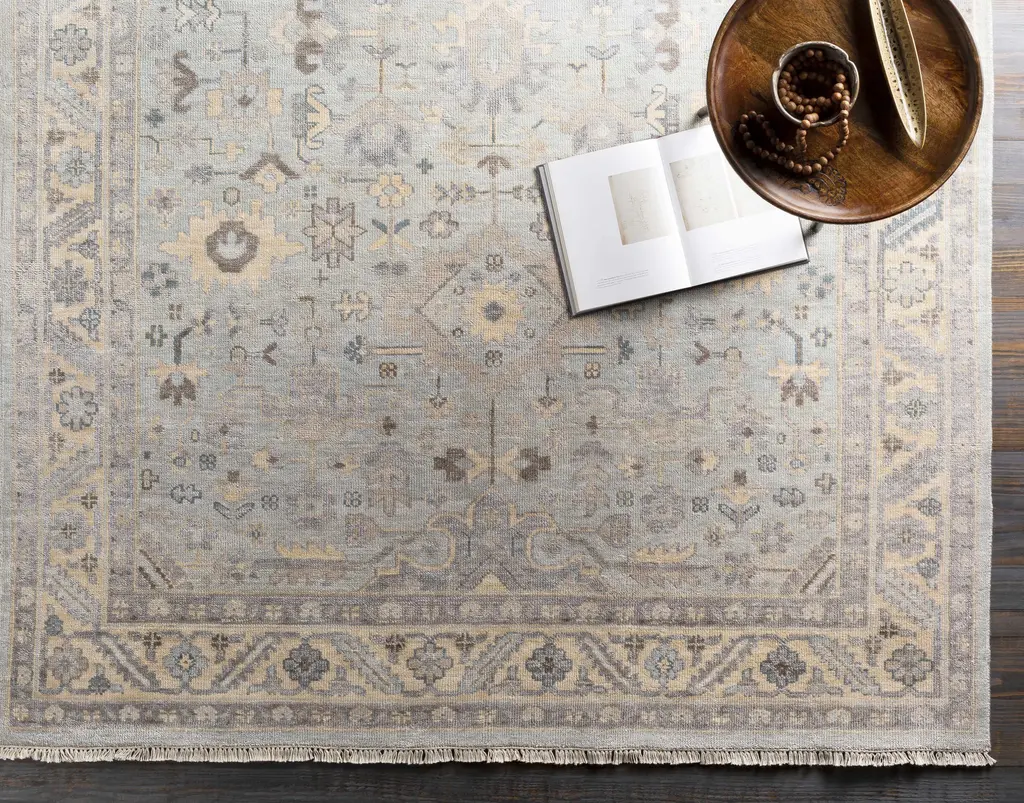 Collection: Niles Colors: Dark Brown, Beige, Gray, Ice Blue, Navy, Peach Construction: Hand Knotted Material: 100% Viscose Pile: Low Pile Pile Height: 0.19" Styles: Traditional Made In: India Thickness: 0.31" Fringe Length: 1.5" Price Range: $$$$$ (Premium)