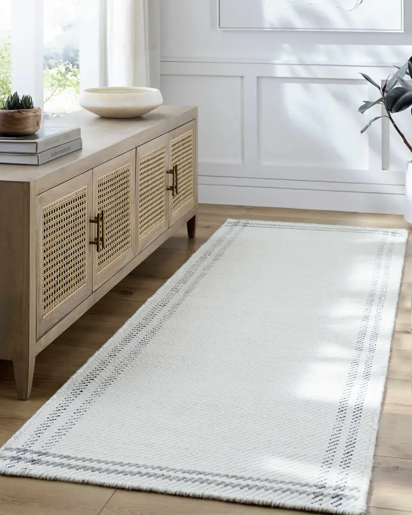 Collection: Nimue Colors: Light Silver Construction: Hand Woven Material: 100% Wool Pile: No Pile Styles: Transitional,Traditional Made In: India Thickness: 0.4" Price Range: $$$$$ (Affordable)