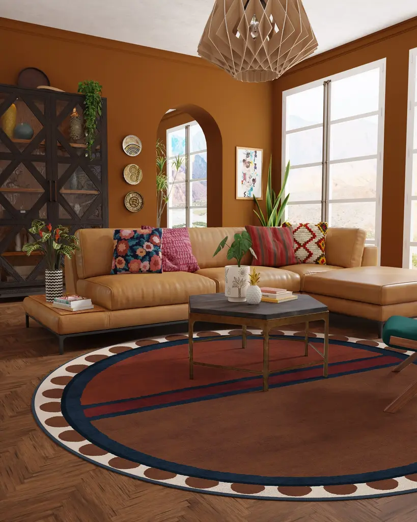 Your home is your canvas with our Justina Blakeney Nina Indigo & Rust Rug. Inspired by the work of abstract expressionist Mark Rothko, this geometric design features scalloped-edge curves and fluid colors, echoing Justina's sense of style. The cream and camel border, along with the navy blue outline, gracefully frames the composition, while rustic orange, red, and camel brown fill in this color-blocked and artistic style. Water-resistant, stain-resistant, and machine-washable. Rug colors may vary slightly according to your device and the lighting in your space.