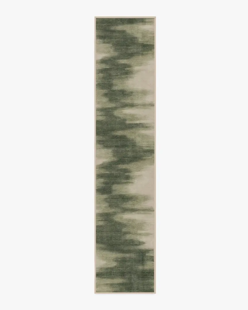 Entertain with ease with our Nina Takesh Cassis Olive Rug. Inspired by movement found in nature, this calming design features a flowing, irregular motif that resembles the path of a river. A peaceful variety of olive green hues set against a soft stone background celebrates the various forms of plants such as majestic trees, delicate leaves, and lush moss. Water-resistant, stain-resistant, and machine-washable. Rug colors may vary slightly according to your device and the lighting in your space.